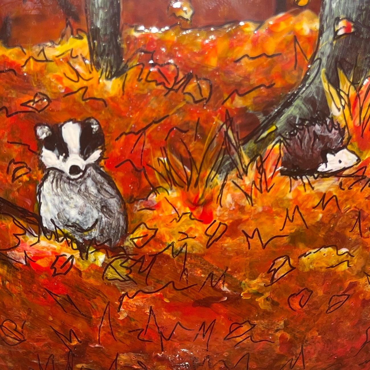 This piece is a celebration of autumn and the love of animals it features a friendly fox, teeny snail, squirrel, mouse, hedgehog, badger, hare, crow, owl, robin and a happy little mole popping up to say hello! Kelly worked really hard creating her essense of autumn, having a lot of fun this future heirloom and it shows.