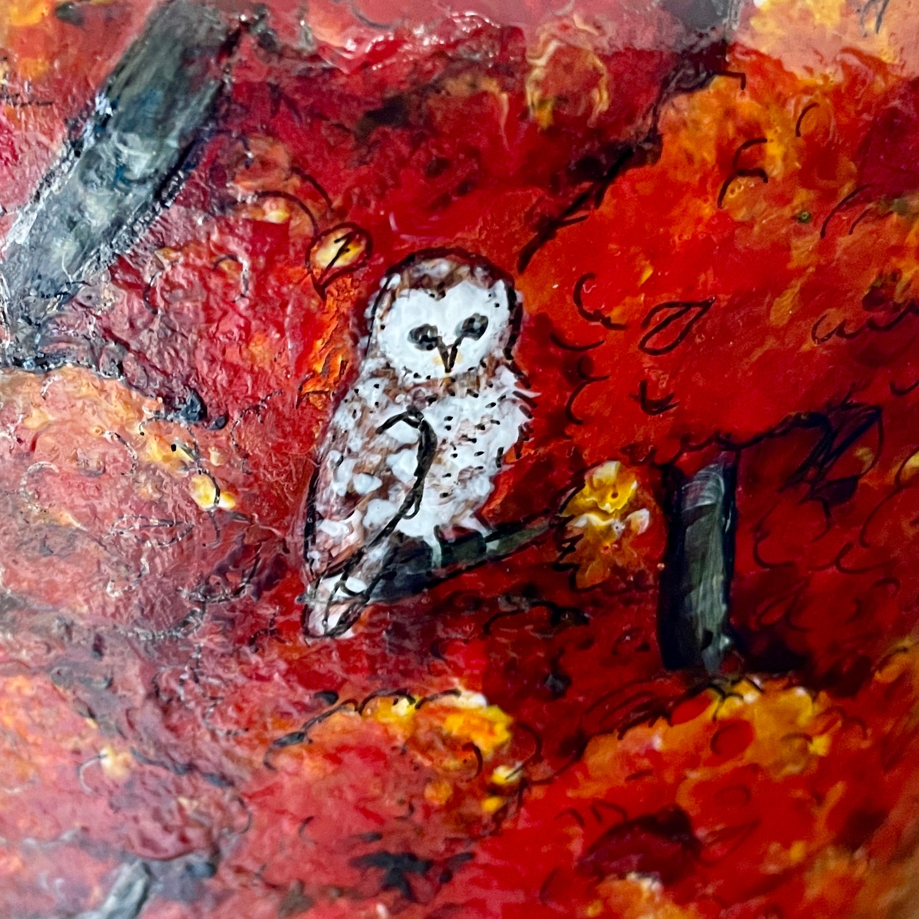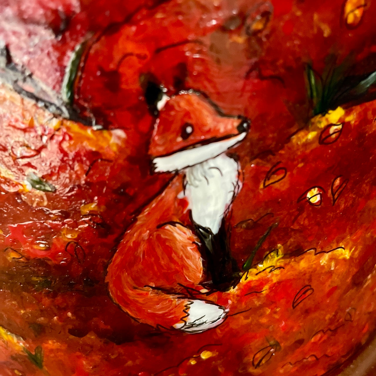 Kelly loves the vibrancy, colour and warmth of autumn in nature, so creating this truly special piece was a pleasure for her. As with all her work, she painted the design freehand, slowly building the texture and colour, a layer at a time. A crisp autumn walk in the woods, full of life is always a calming happy experience for Kelly, she wanted to capture it for your home too!