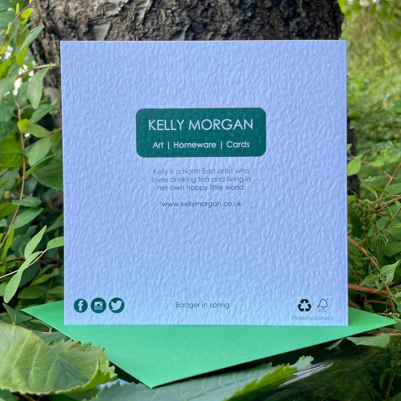 The design on this card 'Badger in spring' is taken from Kelly Morgan's original artwork, and it's blank inside for your own message.