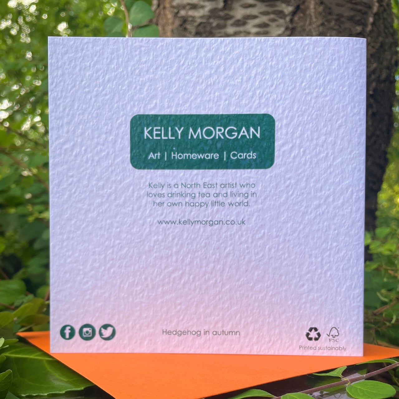 The design on this card 'Hedgehog in autumn' is taken from Kelly Morgan's original artwork, and it's blank inside for your own message.
