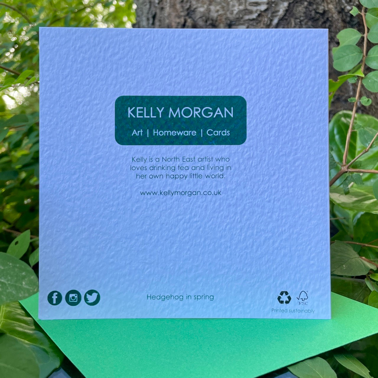 The design on this card 'Hedgehog in spring' is taken from Kelly Morgan's original artwork, and it's blank inside for your own message.