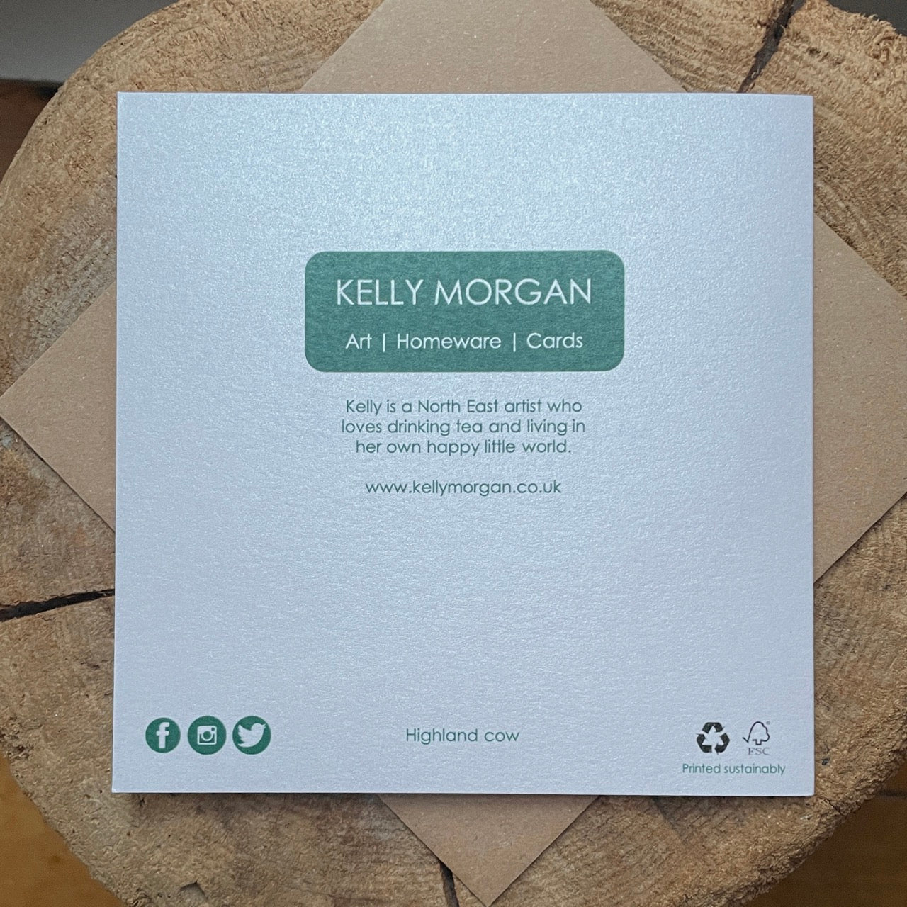 The design on this card 'Highland cow' is taken from artist Kelly Morgan's original artwork, and it's blank inside for your own message.