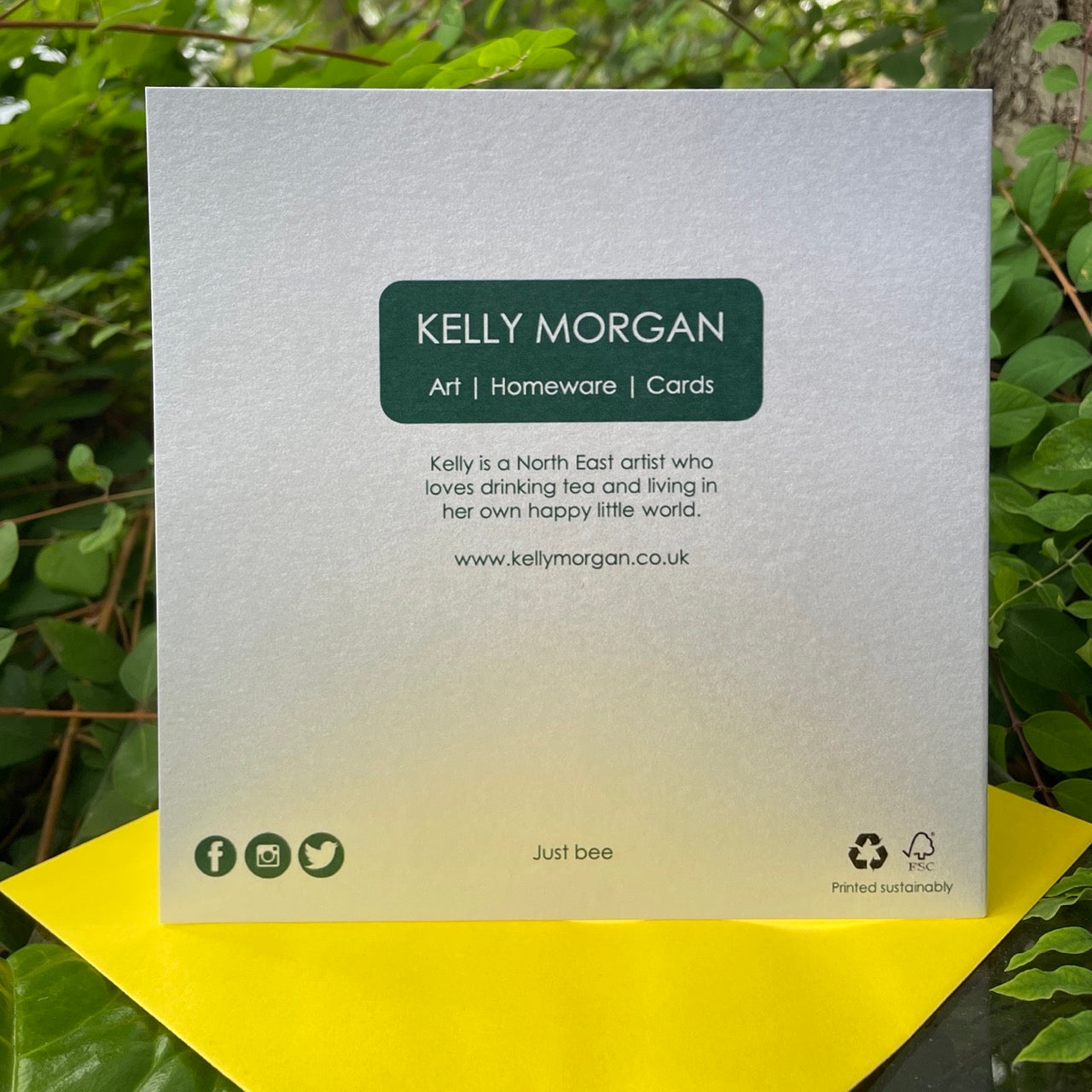 The design on this card 'Just bee' is taken from artist Kelly Morgan's original artwork, and it's blank inside for your own message.
