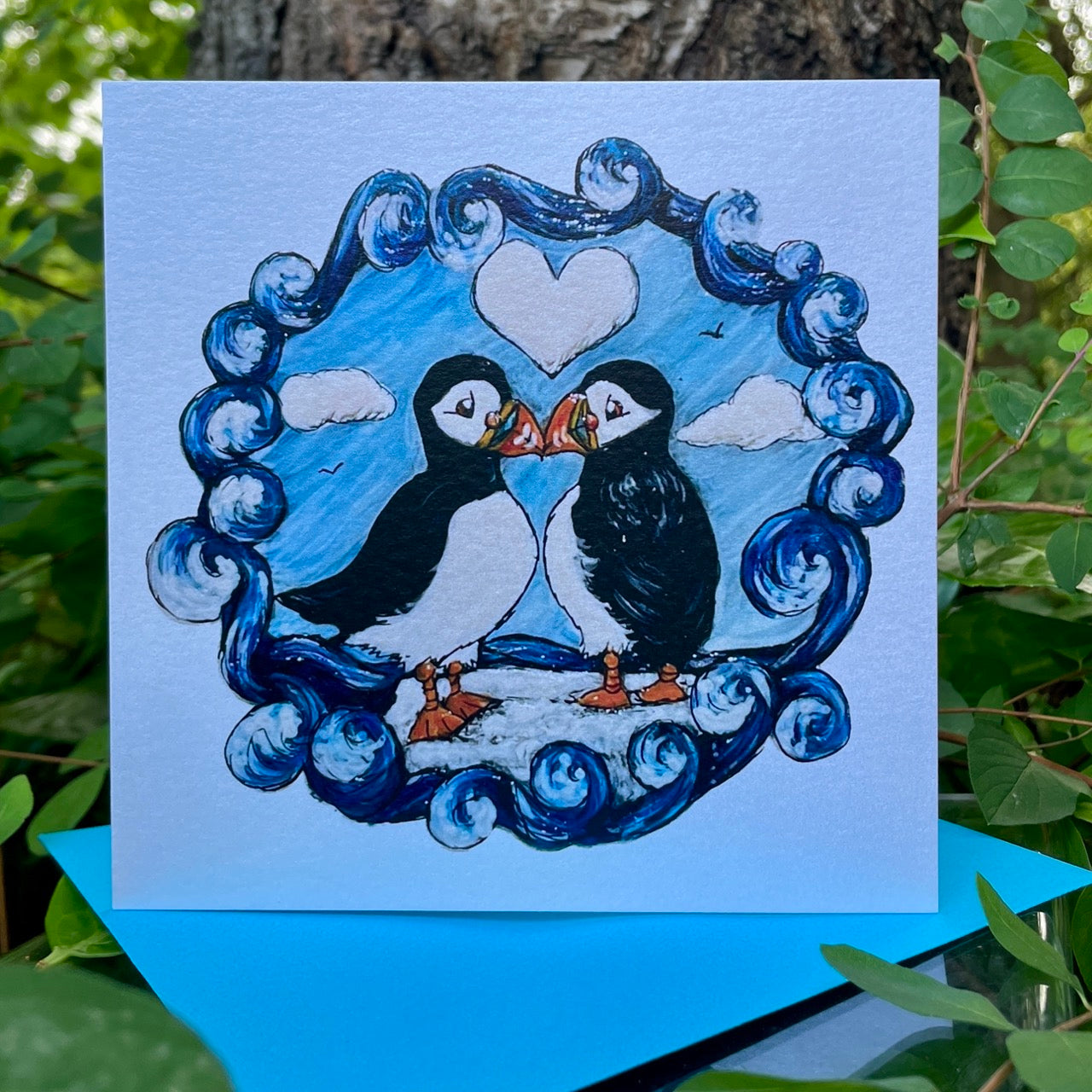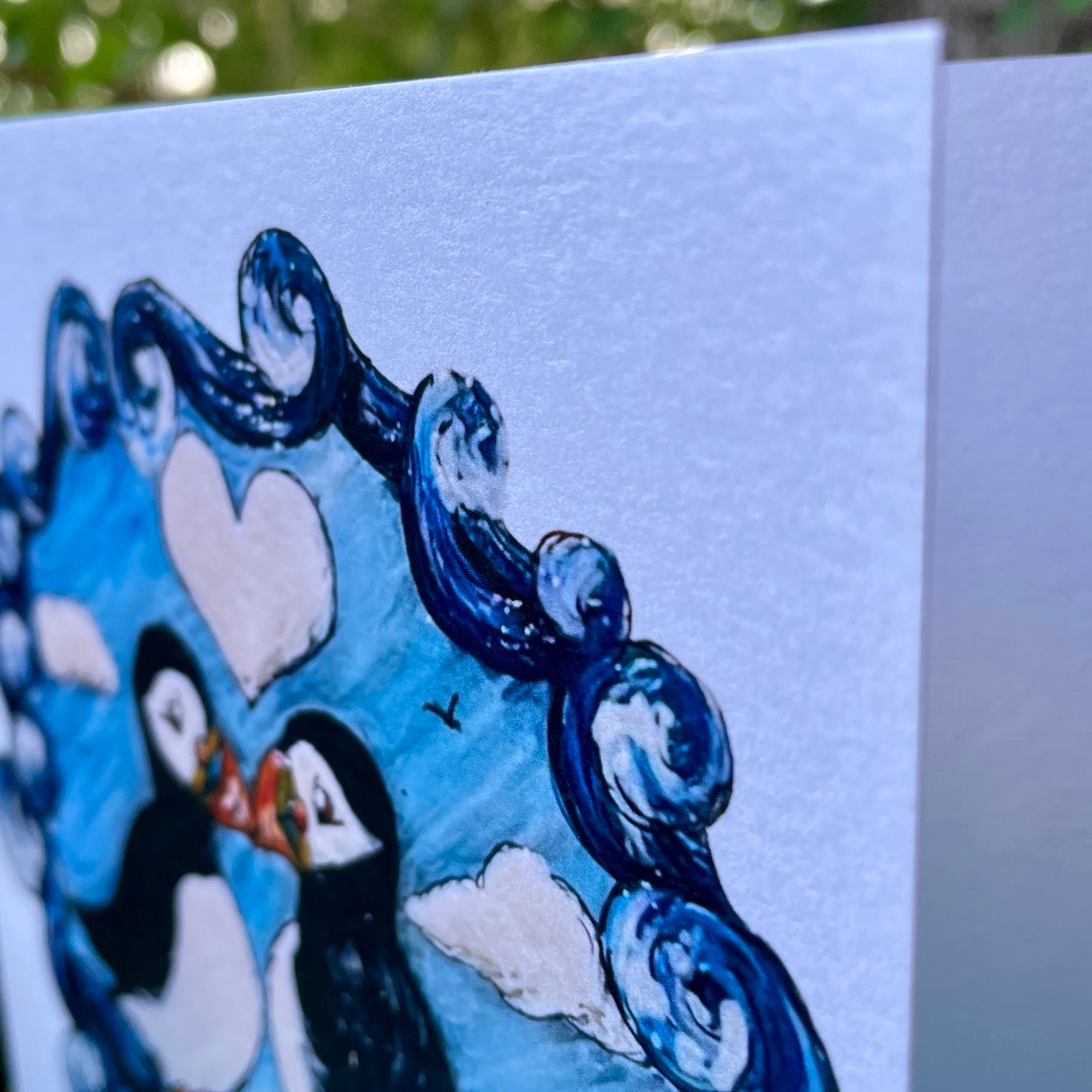 The design on this card 'Puffin love' is taken from Kelly Morgan's original artwork, and it's blank inside for your own message. Kelly's playful 'puffin love' features a pair of colourful puffins resting together amongst the swirling blue waves around them, she loves the fact that puffins mate for life & rub their beaks as a sign of affection.