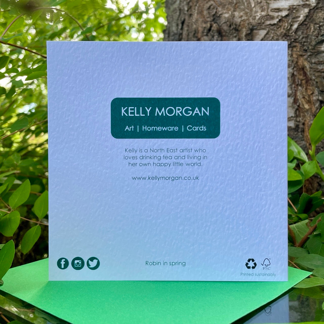 The design on this card 'Robin in spring' is taken from Kelly Morgan's original artwork, and it's blank inside for your own message. These cards have a beautiful textured surface for a subtle, yet eye-catching finish and come with a matching coloured envelope.