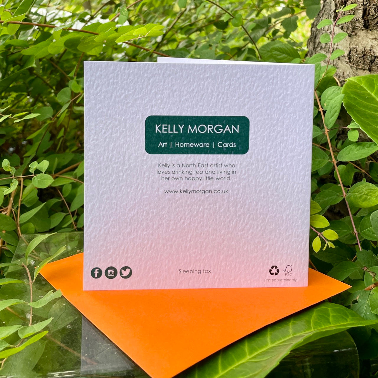 The design on this card 'Sleeping fox' is taken from Kelly Morgan's original artwork, and it's blank inside for your own message. These cards have a beautiful textured surface for a subtle, yet eye-catching finish and come with a matching coloured envelope.