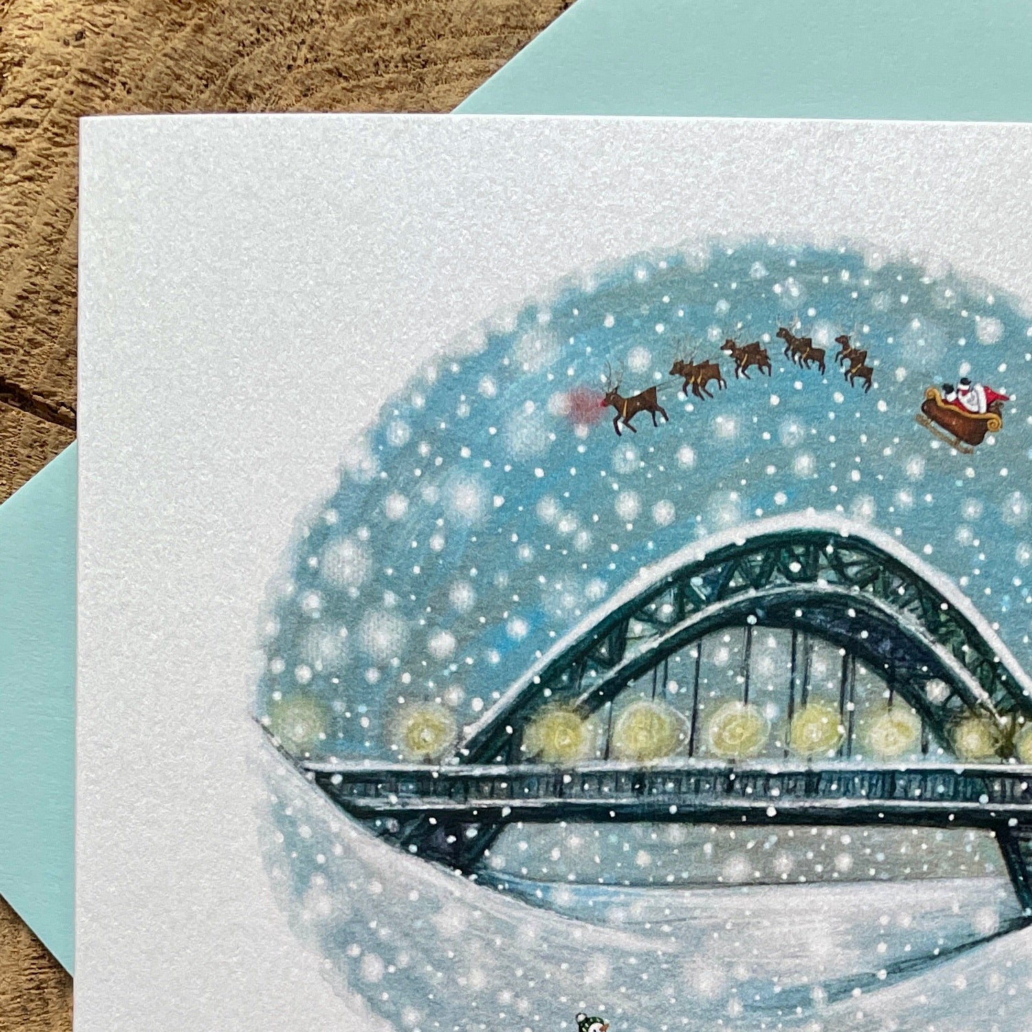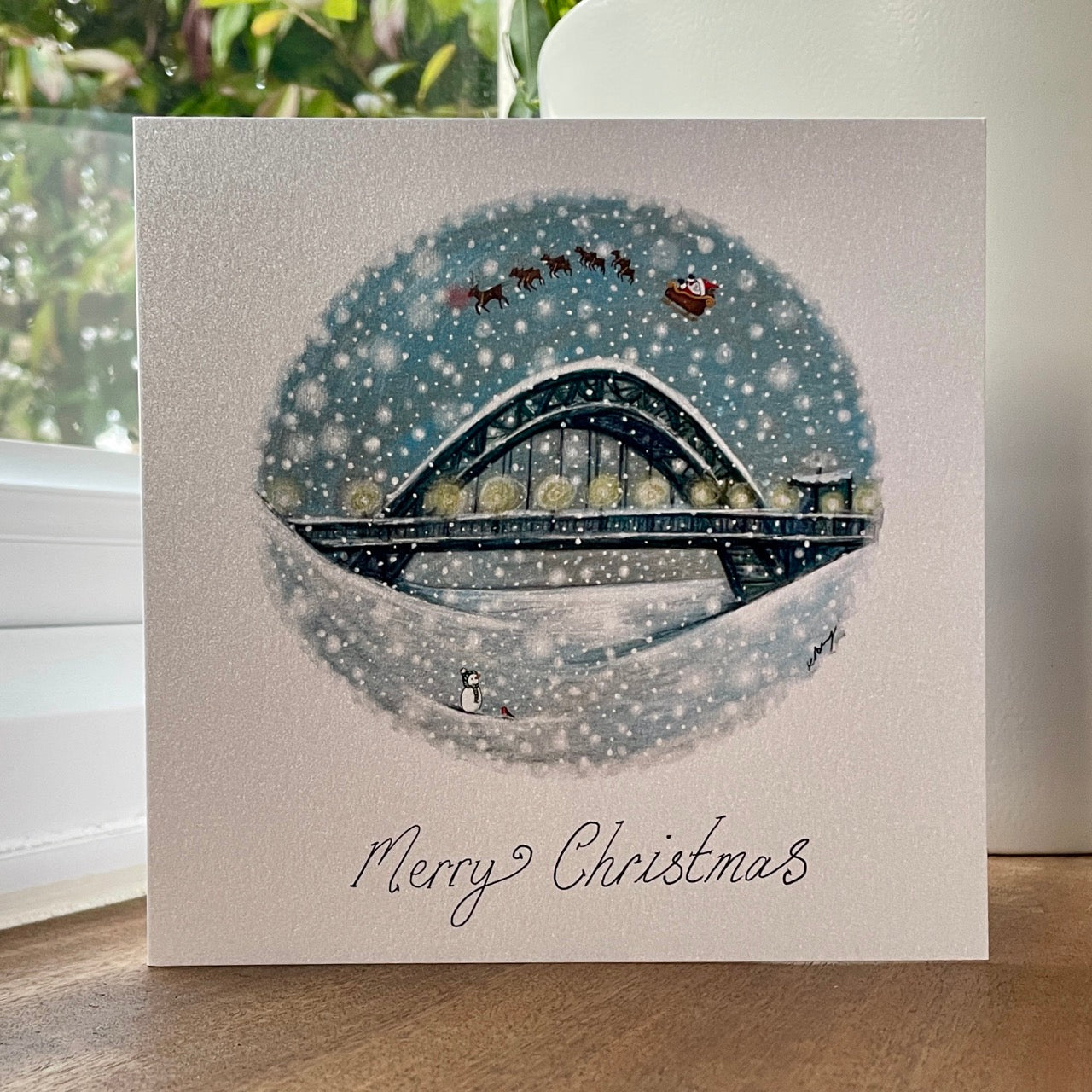 A fun festive design, with Santas sleigh flying over the stunning Tyne Bridge, a happy snowperson and robin waving from the snowed over river Tyne.