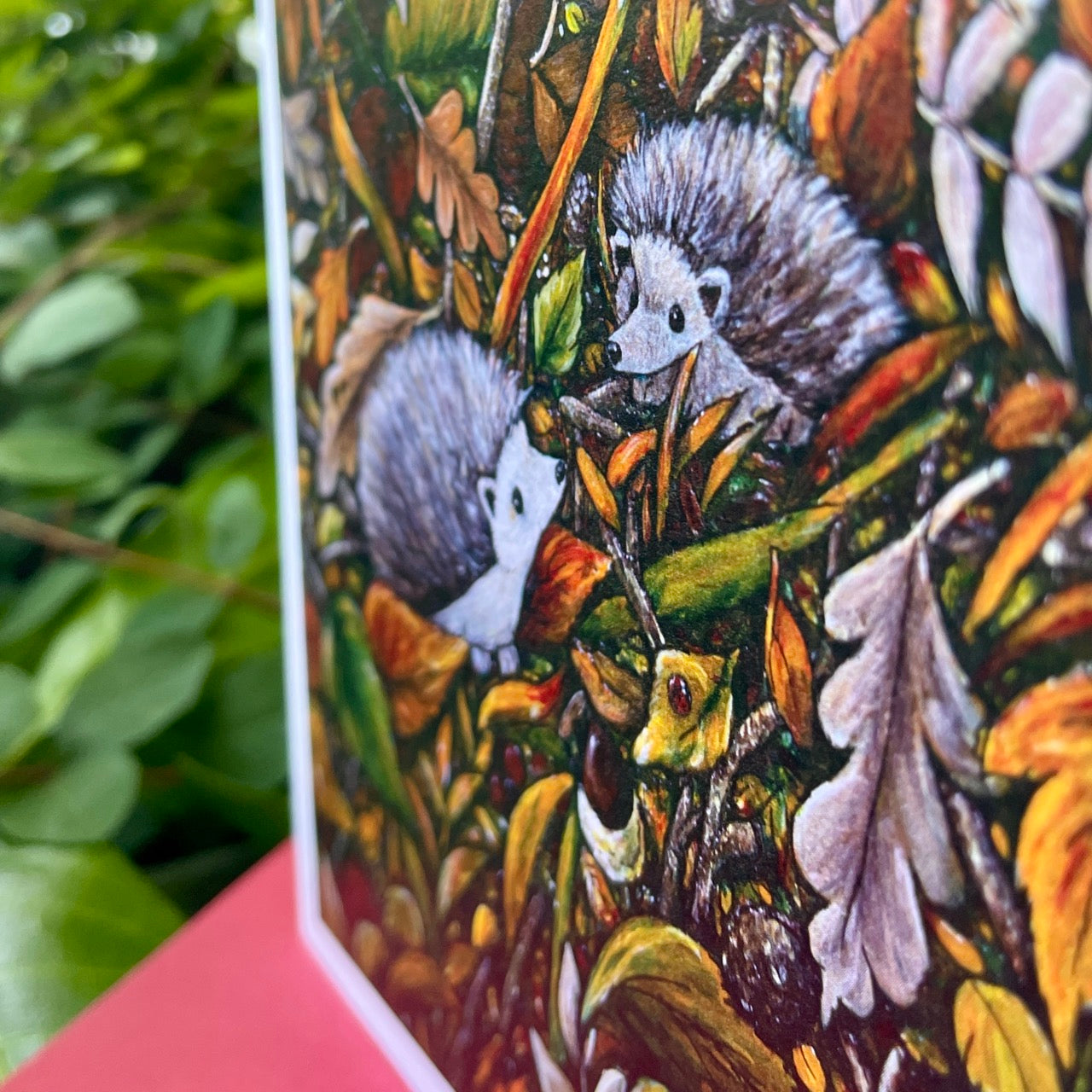 Kelly has loved wildlife since she was a child and this has emerged in her artwork in recent years, as she's started painting a range of birds and animals. Together depicts two of her favourite things: a pair of hedgehogs and autumn leaves.