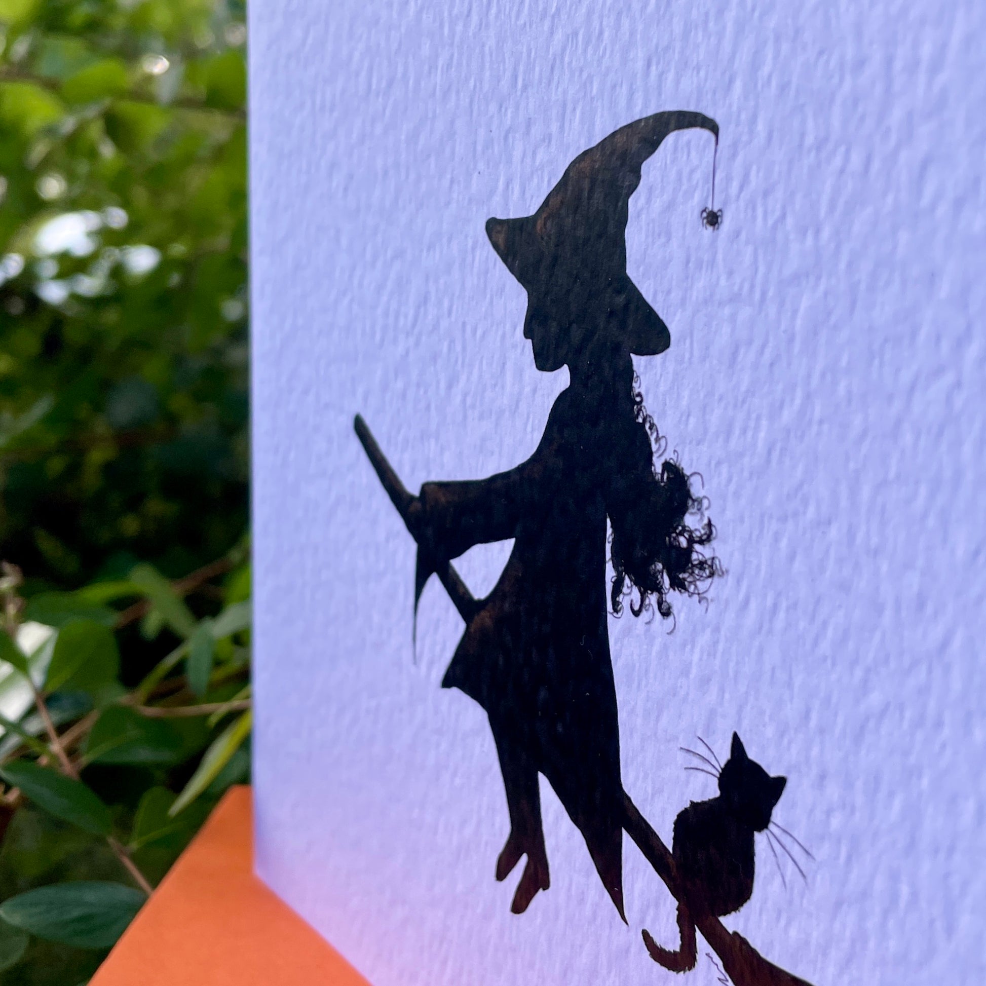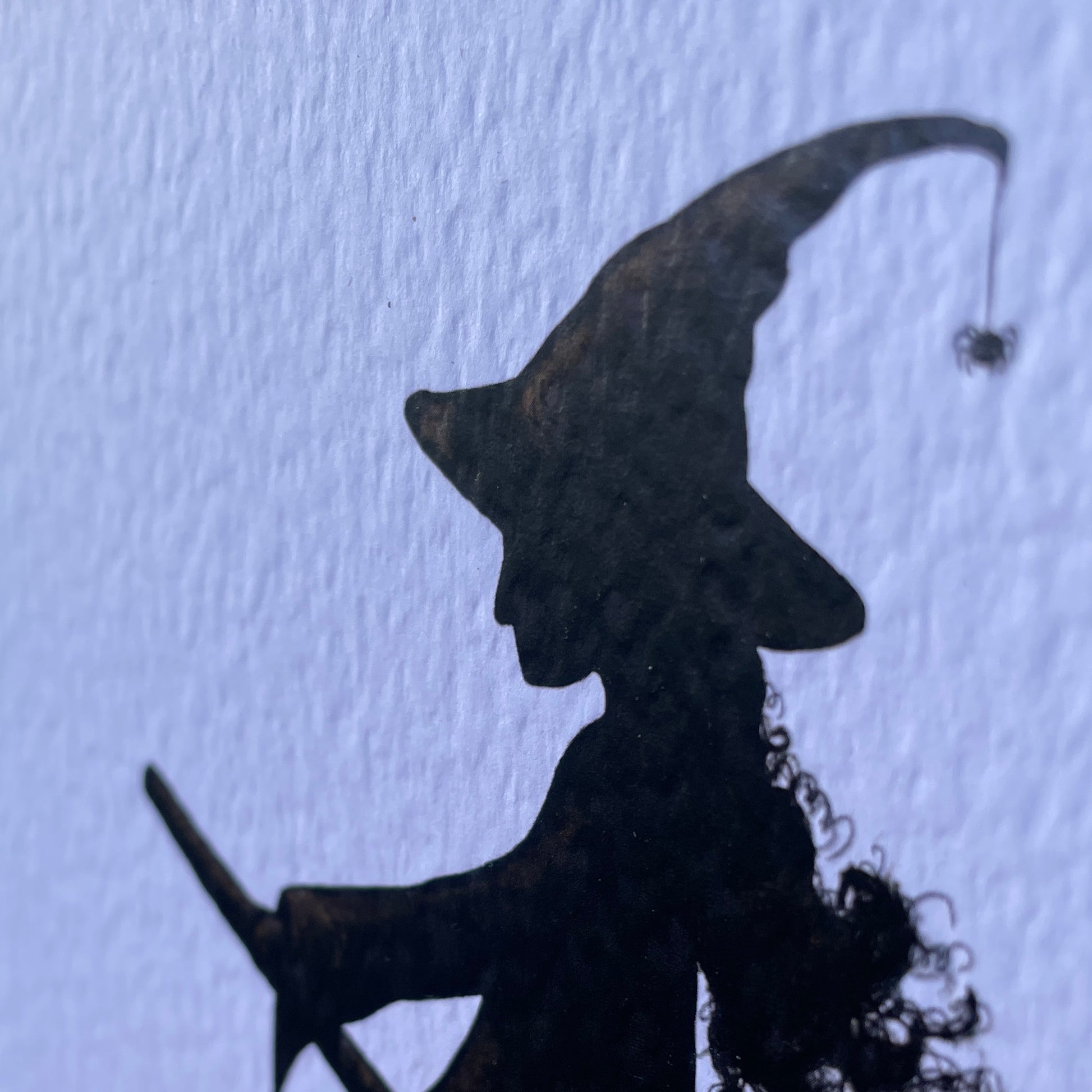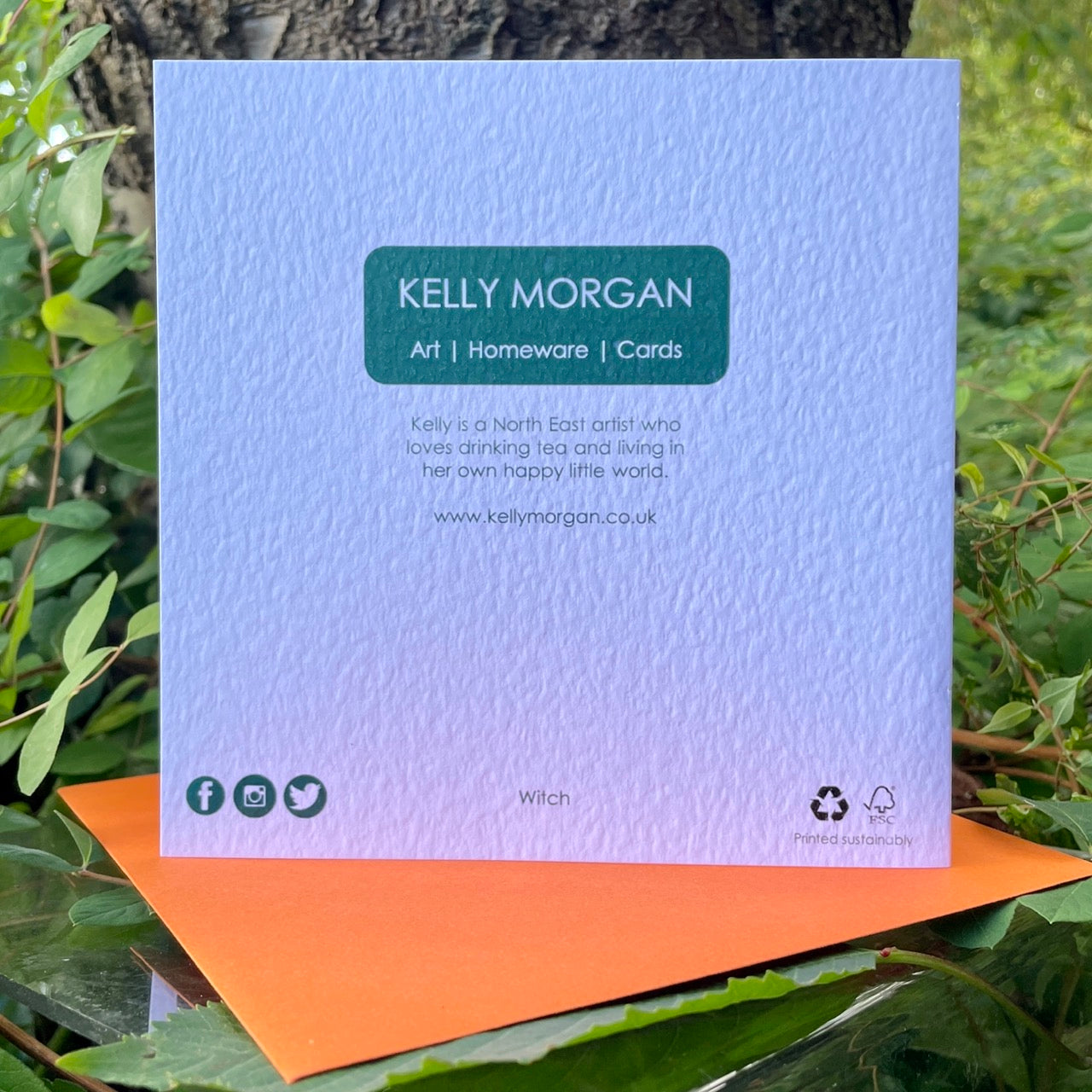 The design on this card 'Witch' is taken from Kelly Morgan's original artwork, and it's blank inside for your own message. These cards have a beautiful textured surface for a subtle, yet eye-catching finish and come with a matching coloured envelope.
