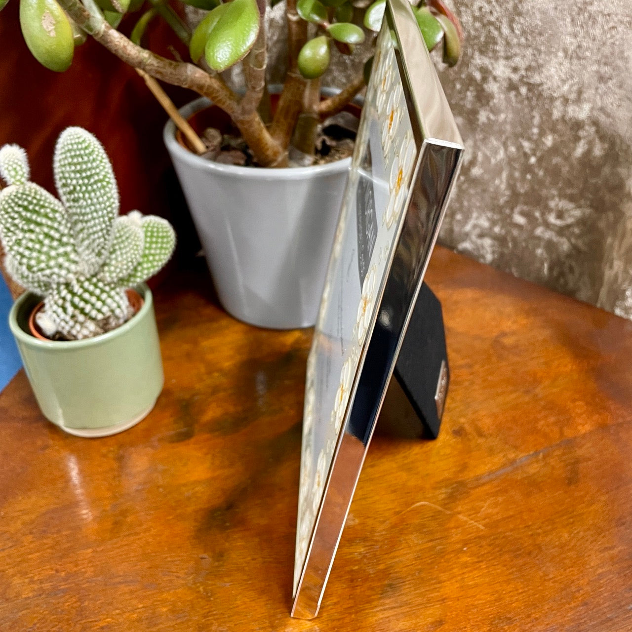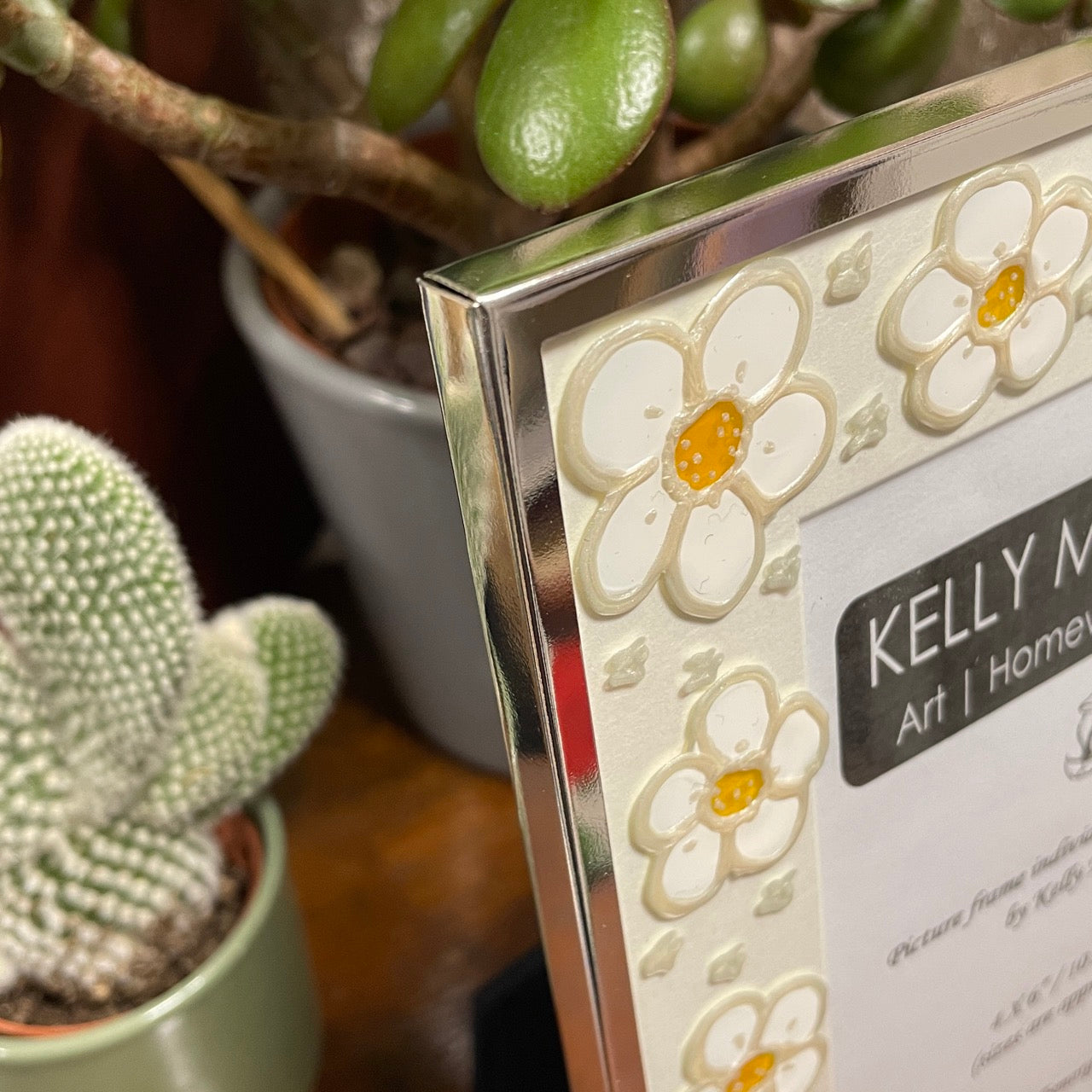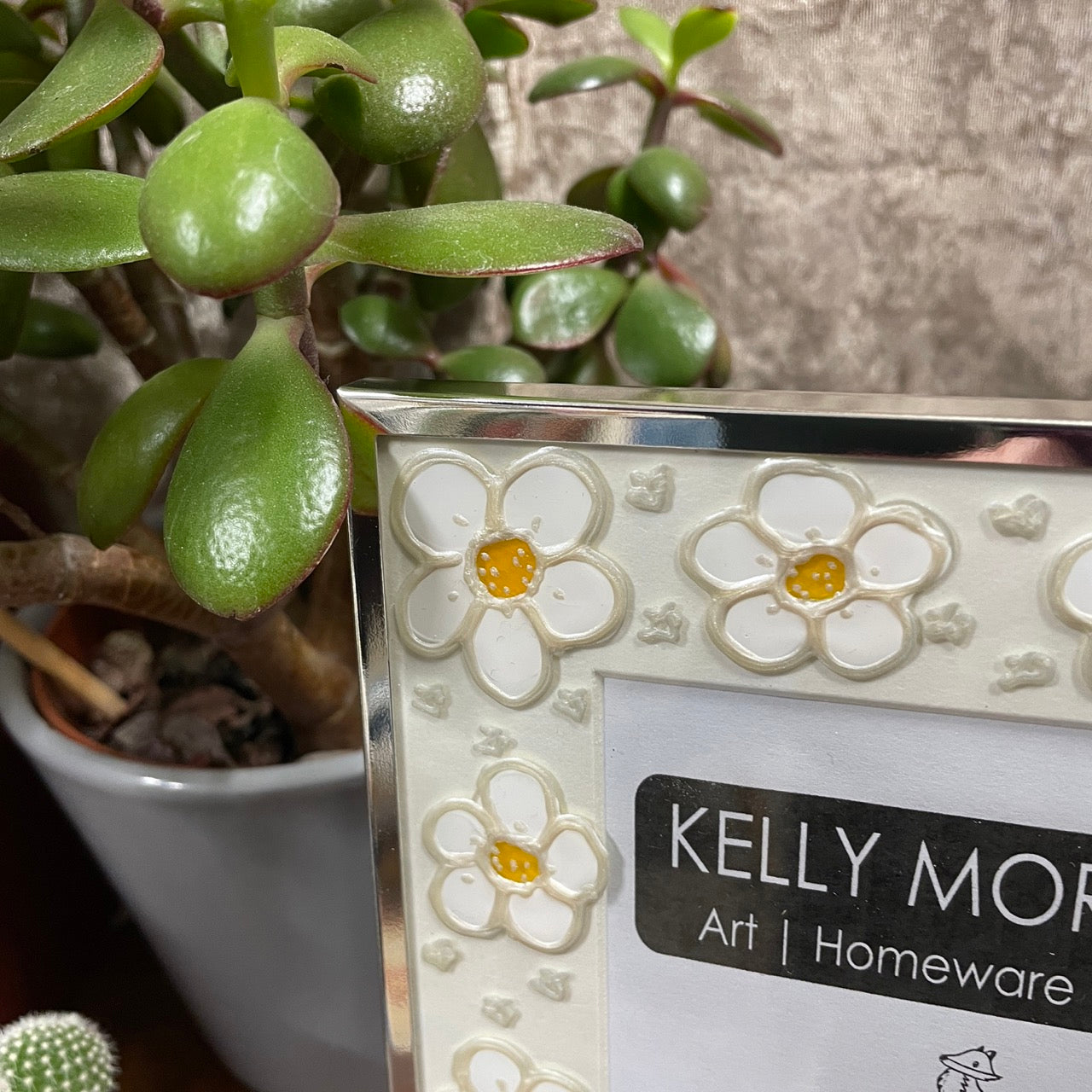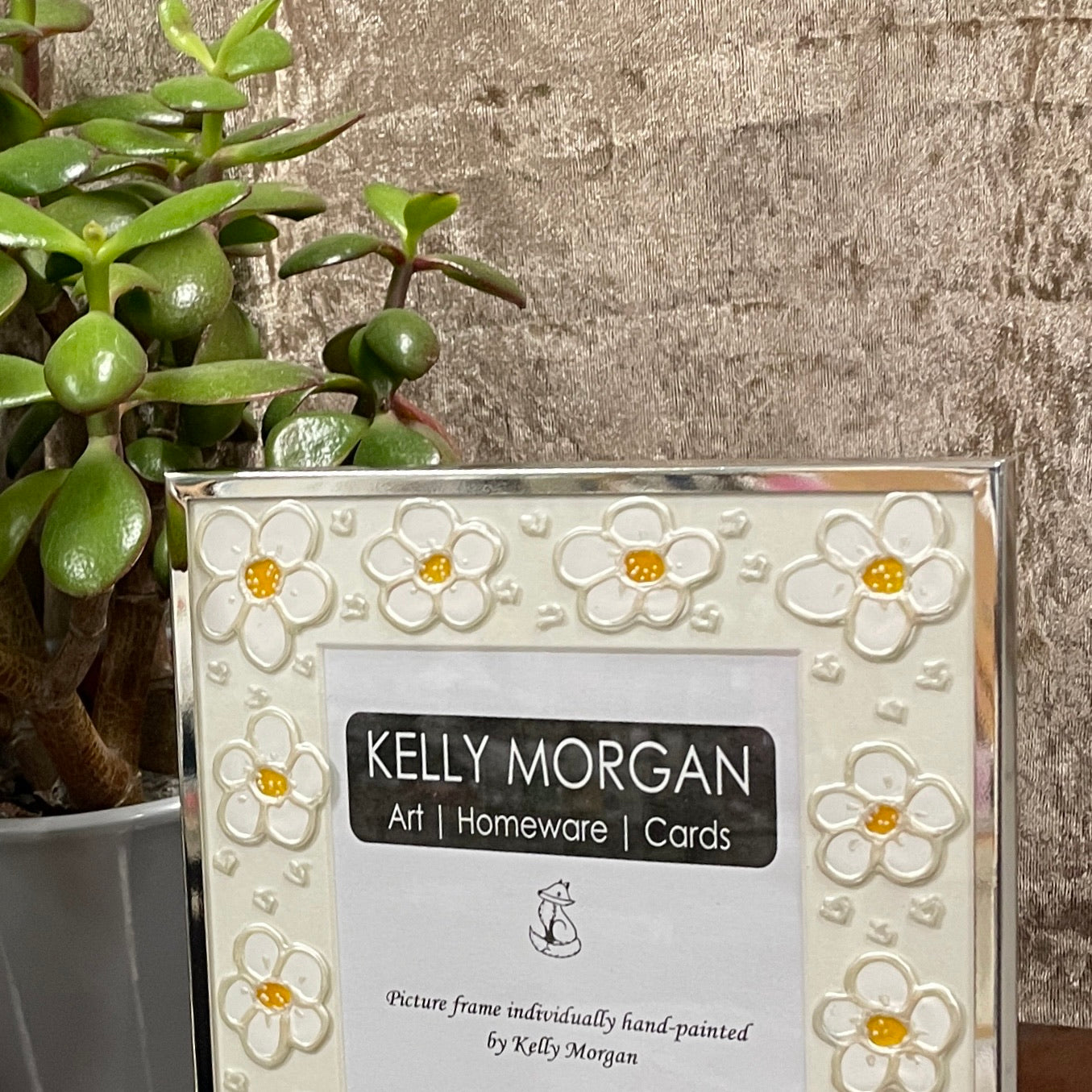 This silver-plated frame is individually hand painted by Kelly Morgan with her Daisy design.
