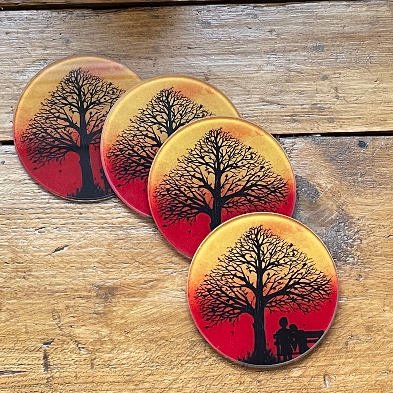 Each glass coaster features a design taken from Kelly Morgan's original artwork. Falling is about the early days of falling in love - and the hope and excitement every sunset brings to a new relationship.