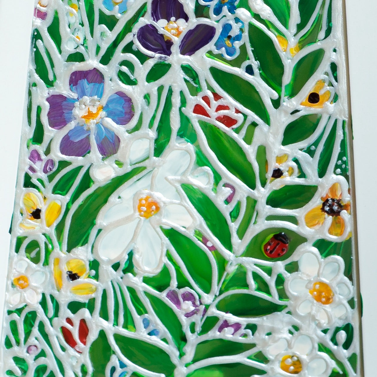 Kelly Morgan has brought this intricate glass & metal lantern to life with her much loved floral garden design, capturing the vivid and attractive colours. Happy butterflies flutter through a variety of gorgeous colourful flowers, featuring of course Kellys favourite ~ daisies.