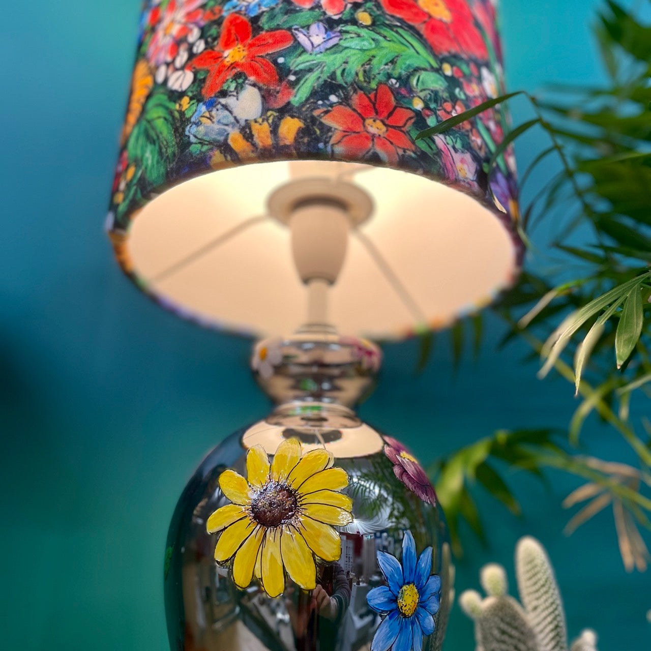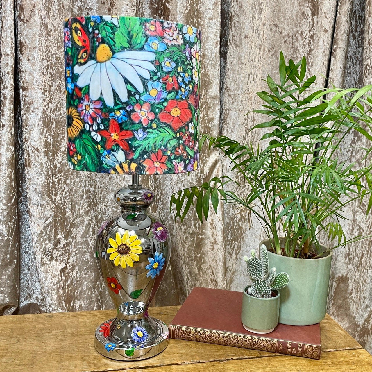 Artist Kelly Morgan loves the vibrancy of colour found in nature, so creating this truly special piece was a pleasure for her. As with all her work, she painted the design freehand, slowly building the texture and colour, a layer at a time. Flower Power is a celebration of the beauty and uplifting qualities of flowers. The mirrored elegant base with it's gorgeously bold shade will elevate your home decor; bringing light and joy to any space.