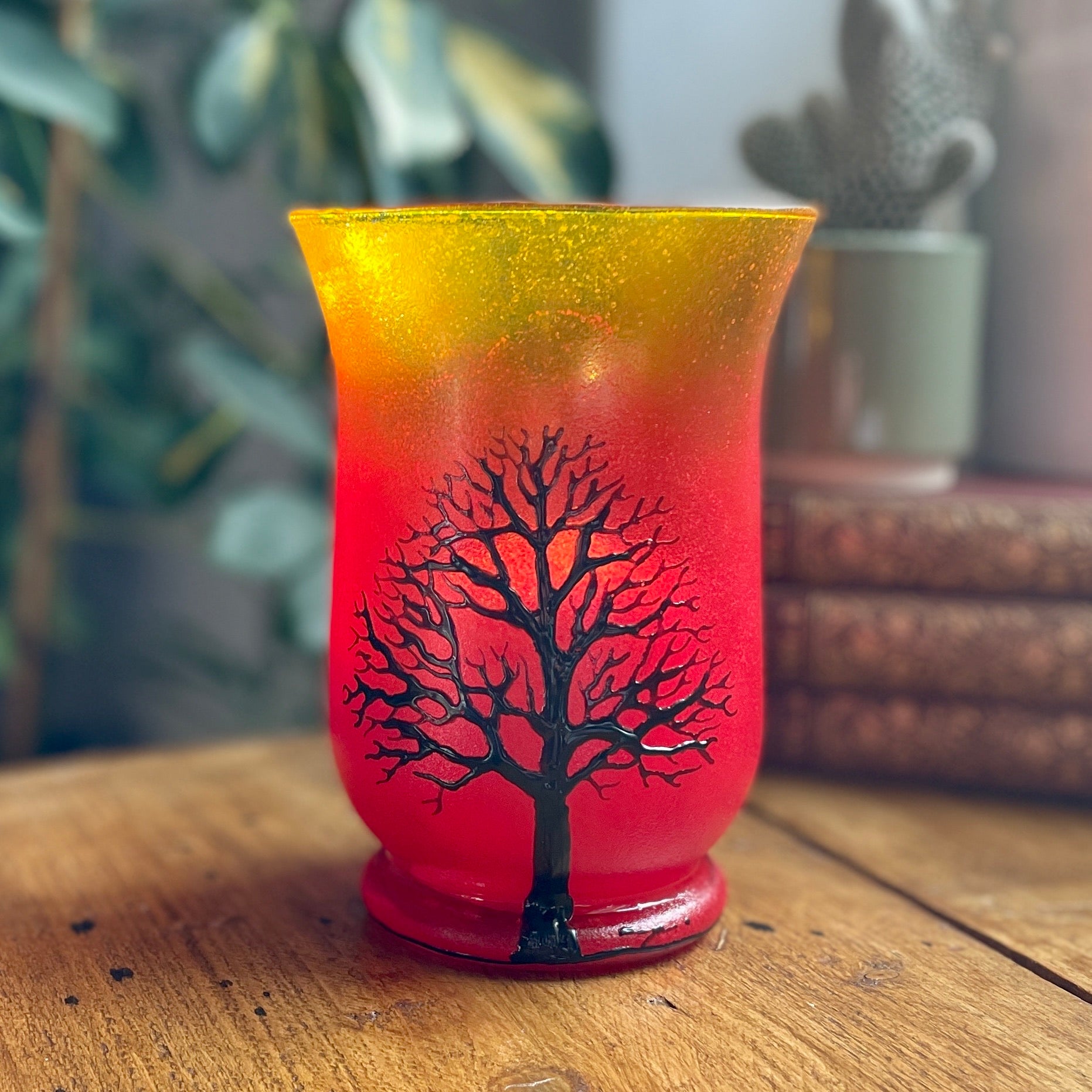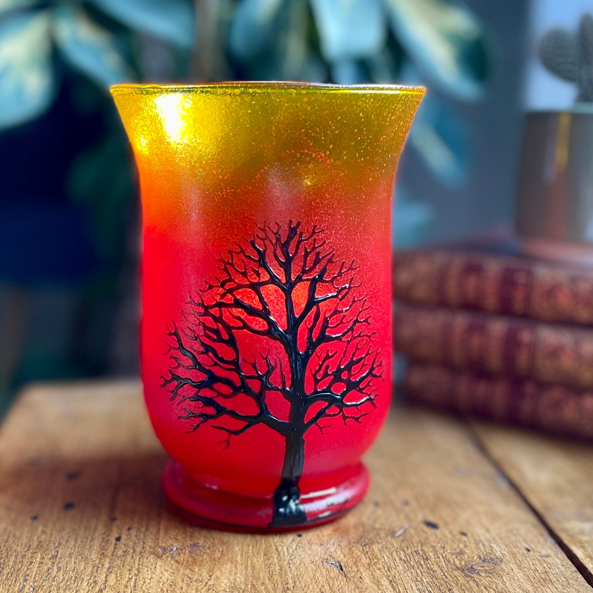 Kelly Morgan individually hand paints each of these beautiful glass hurricane candleholders with her Orange Tree design.