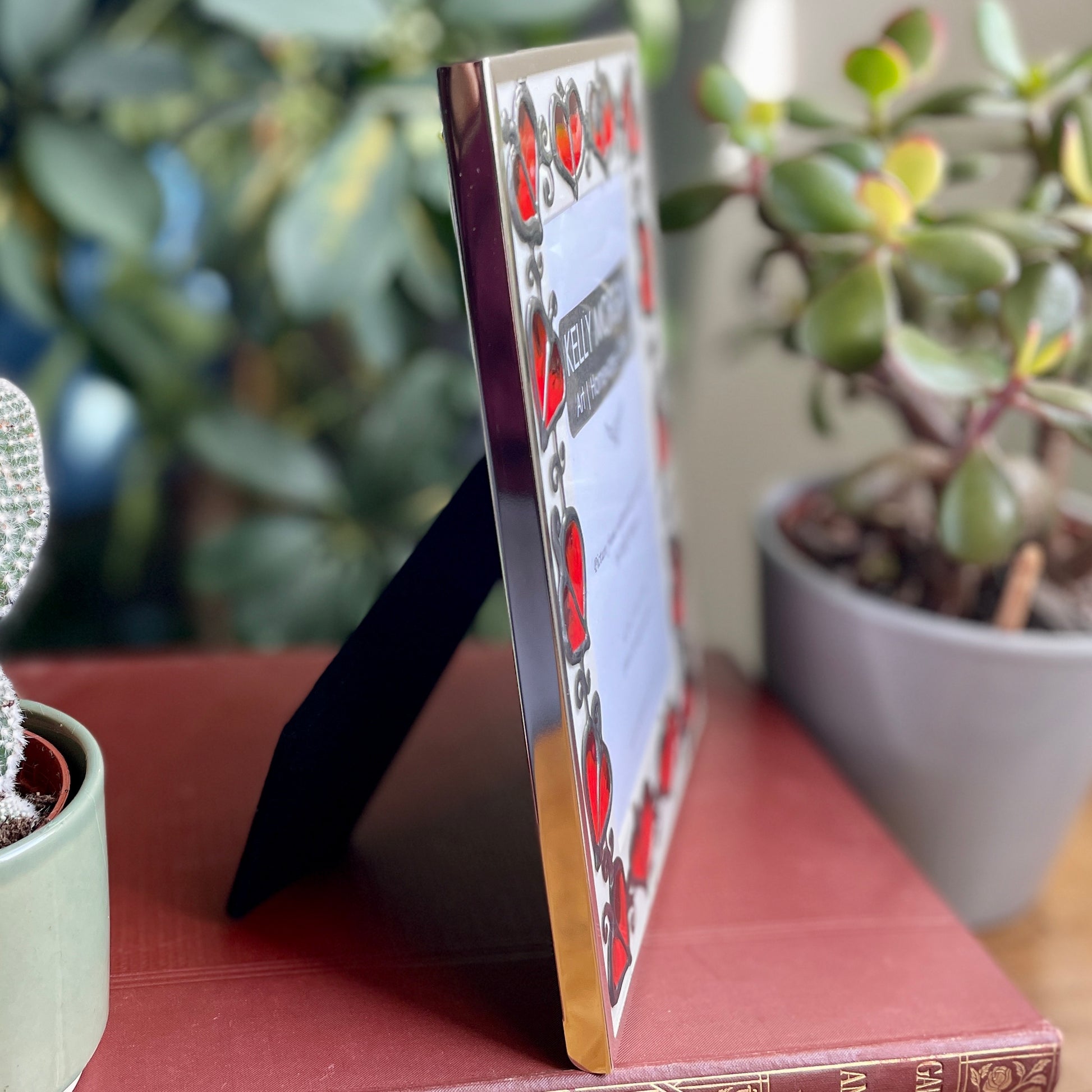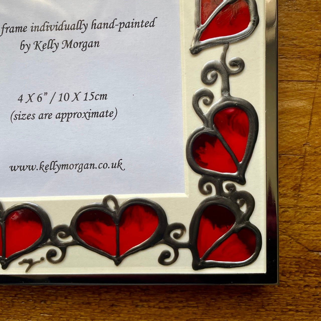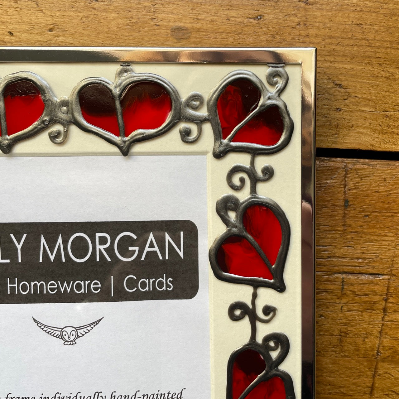 This silver-plated frame is individually hand painted by Kelly Morgan with her Red Leaf design. Kelly's Red leaf design which features a trailing swirl of red heart leaves was inspired by the sweetheart plant gifted to her by her mother in law. It's one of her oldest and most popular designs suitable for many occasions including Weddings, Anniversaries, Birthdays or any celebration at all really!