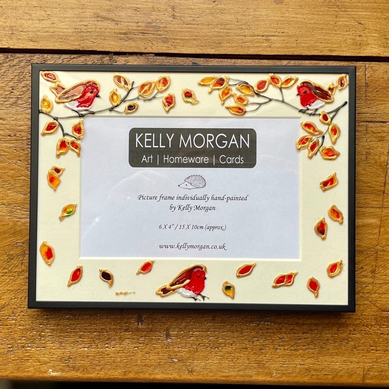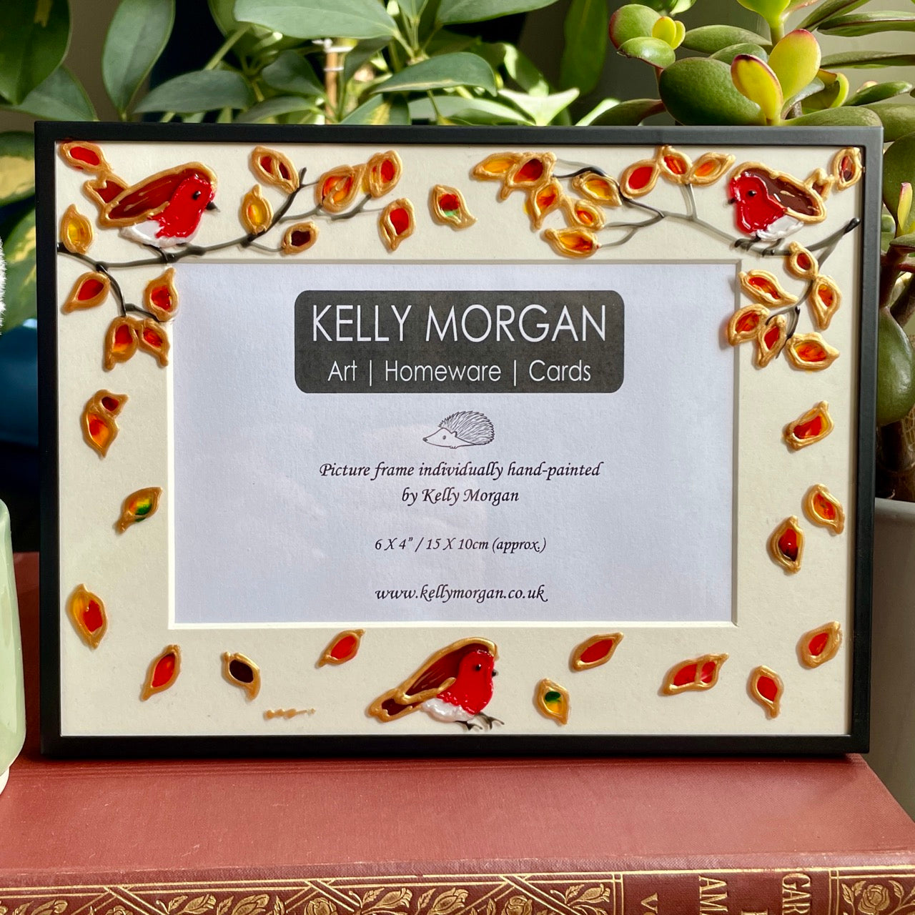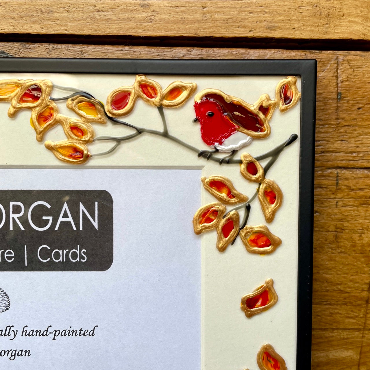 Kelly Morgan individually hand paints each of these black metal landscape frames with her Robins in Autumn design.