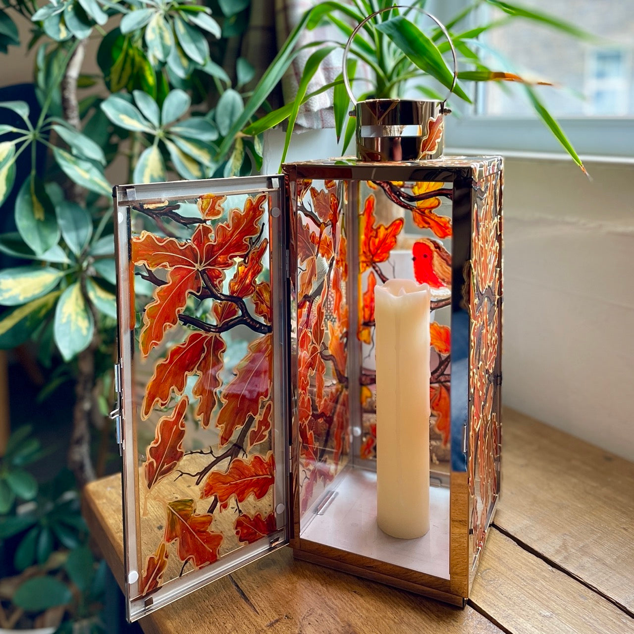 Kelly Morgan has brought this beautiful gold metal & glass lantern to life with her Robin Love design, capturing the playful, friendly nature of one of her favourite birds. The gorgeous gold metal frame of the lantern & the vibrant autumnal scene complement each other beautifully; and are highlighted both when it is lit and when the sun shines through it.