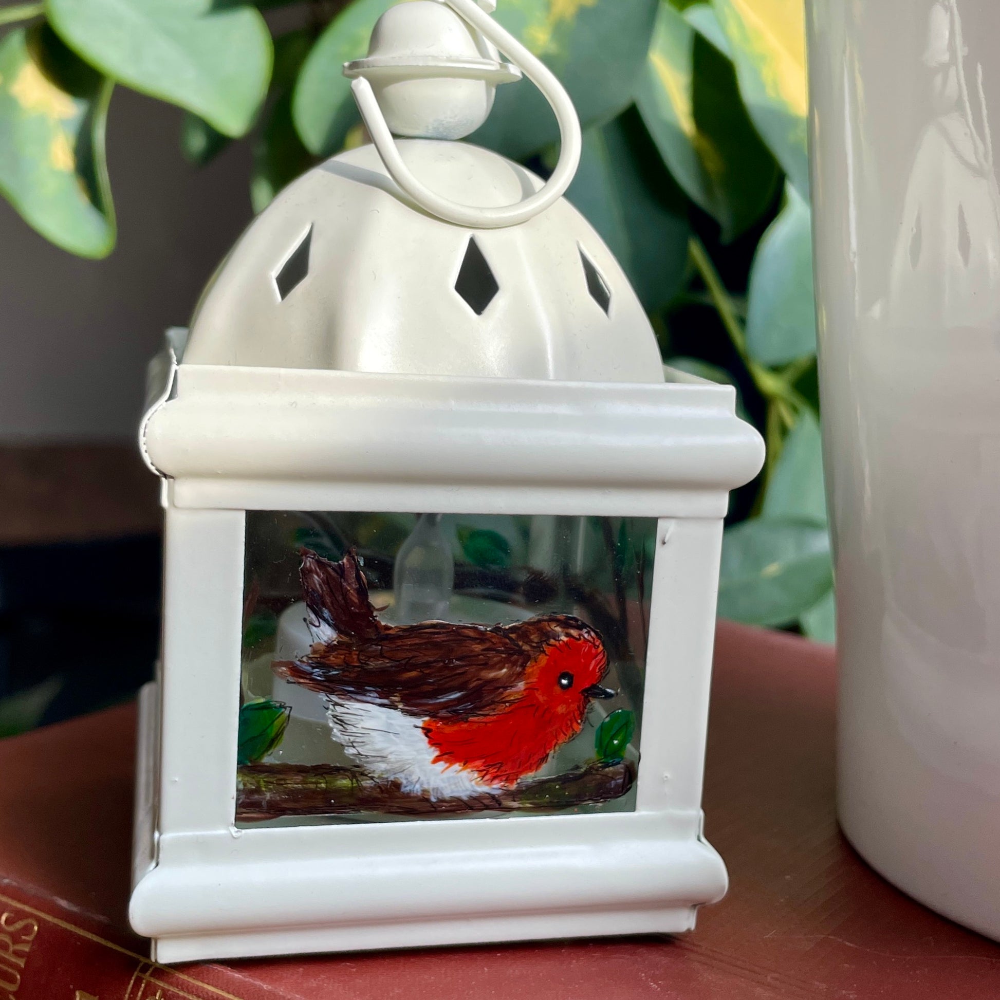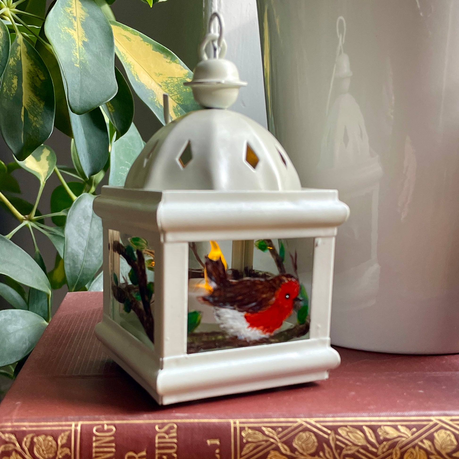 his small lantern was individually selected, designed and hand-painted by Kelly Morgan, so it is one of a kind. The delicate white metal & glass lantern, has been intricately painted with a friendly red breasted robin on a branch.