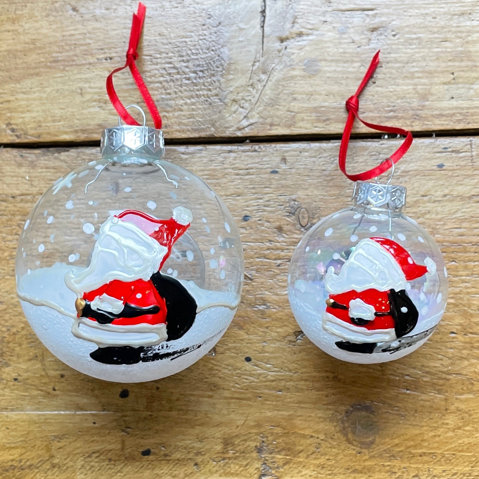 Kelly Morgan individually hand-paints her Santa design onto each of these glass baubles - so every single one is unique. Your bauble will be strung with ribbon when you buy it, so all you need to do is find the perfect place to hang it.