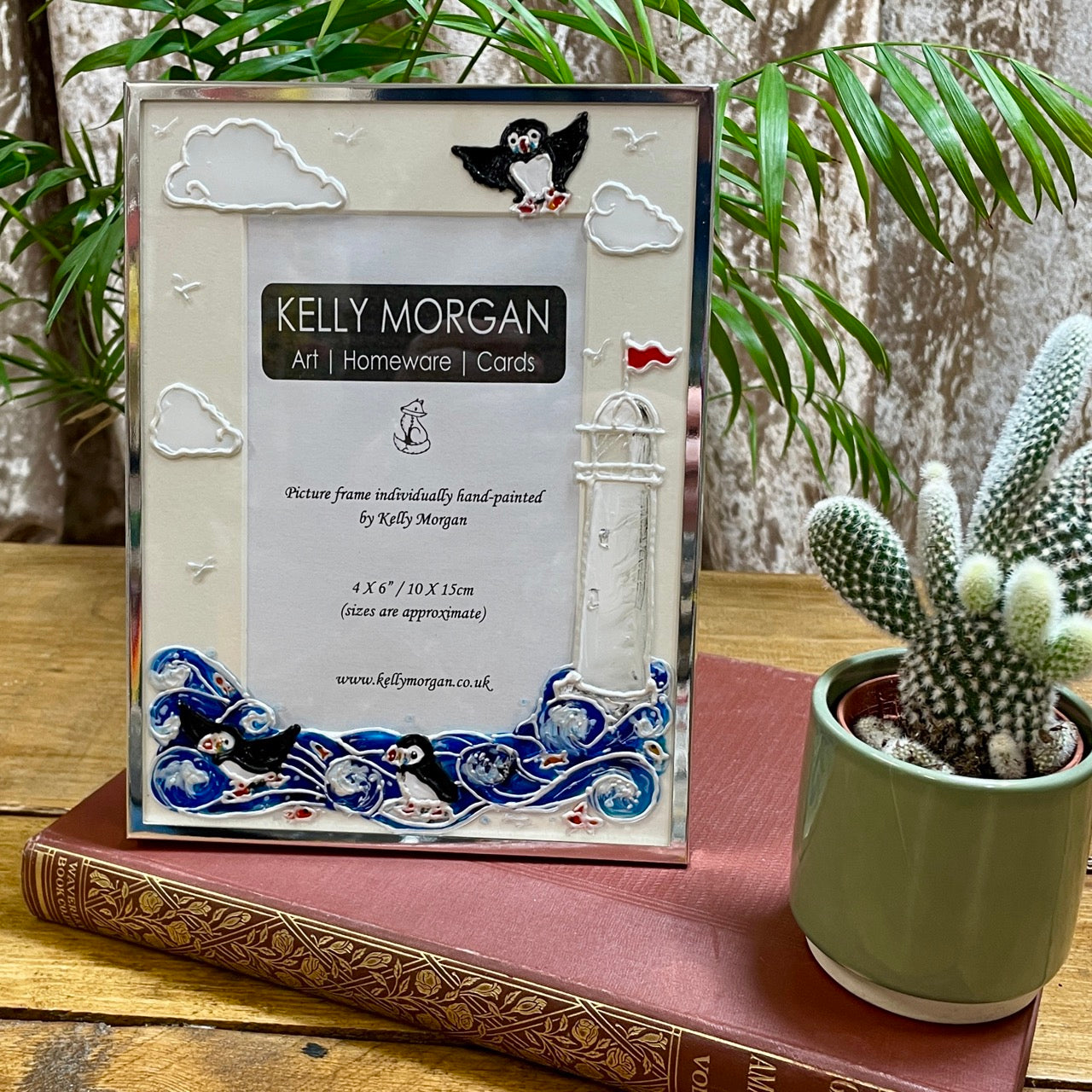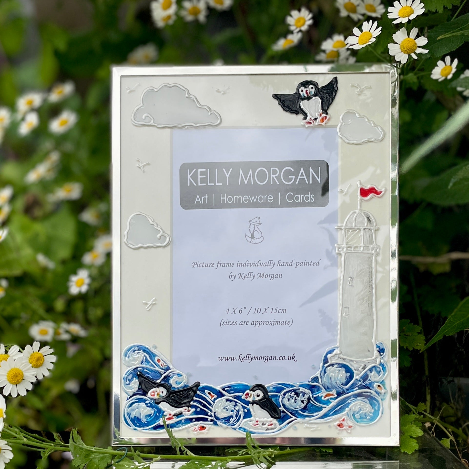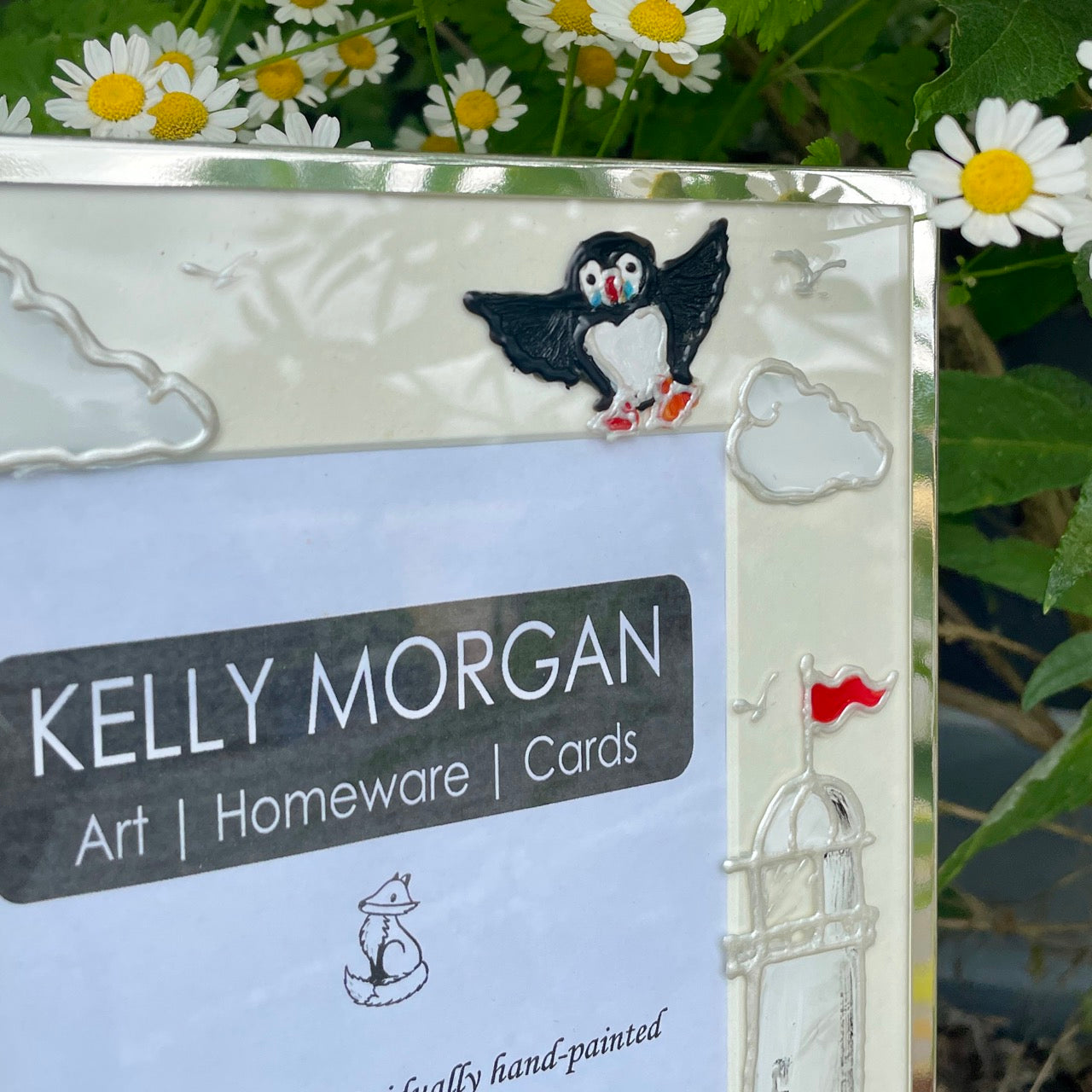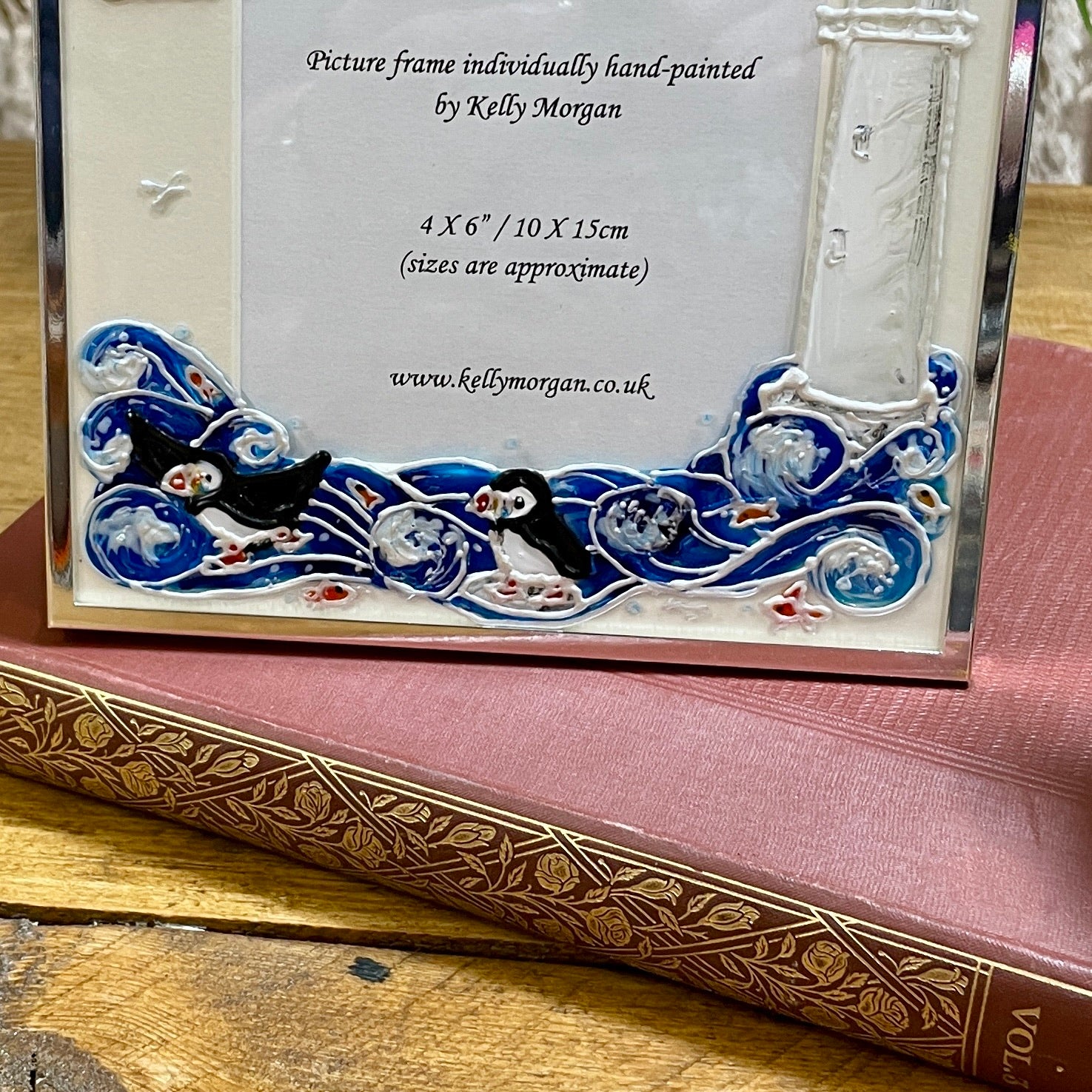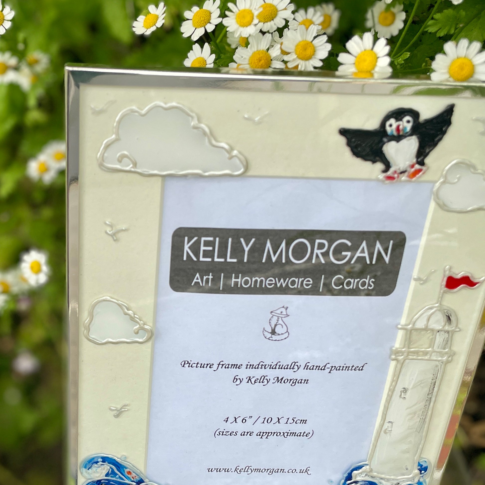 This silver-plated frame is individually hand painted by artist Kelly Morgan with her Seaside design. Kelly's Seaside design, with its vivid and attractive nautical colours is always a favourite. The striking lighthouse, swirling blue waves & puffins loving life, evoking happy seaside memories of the simple joys found at the seaside