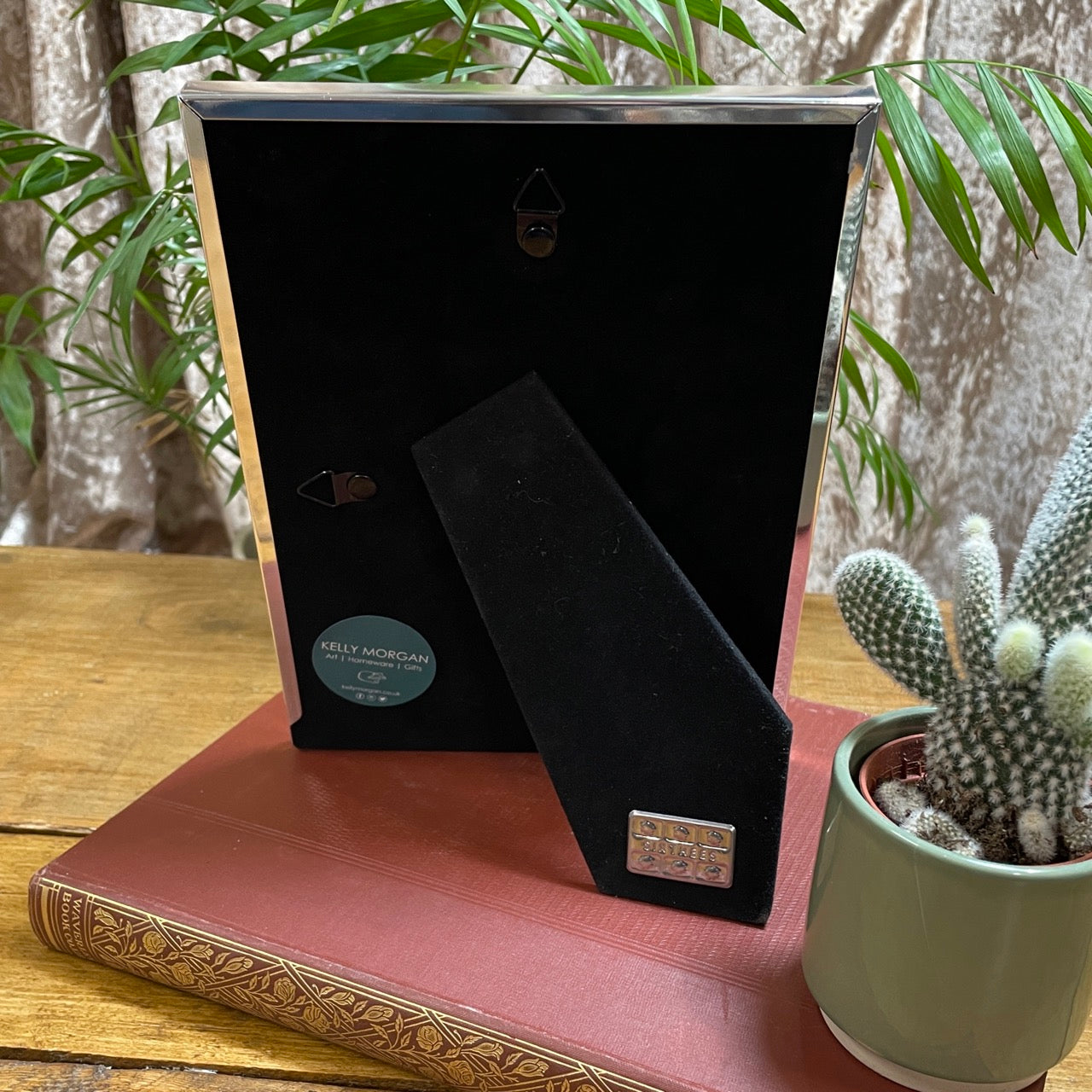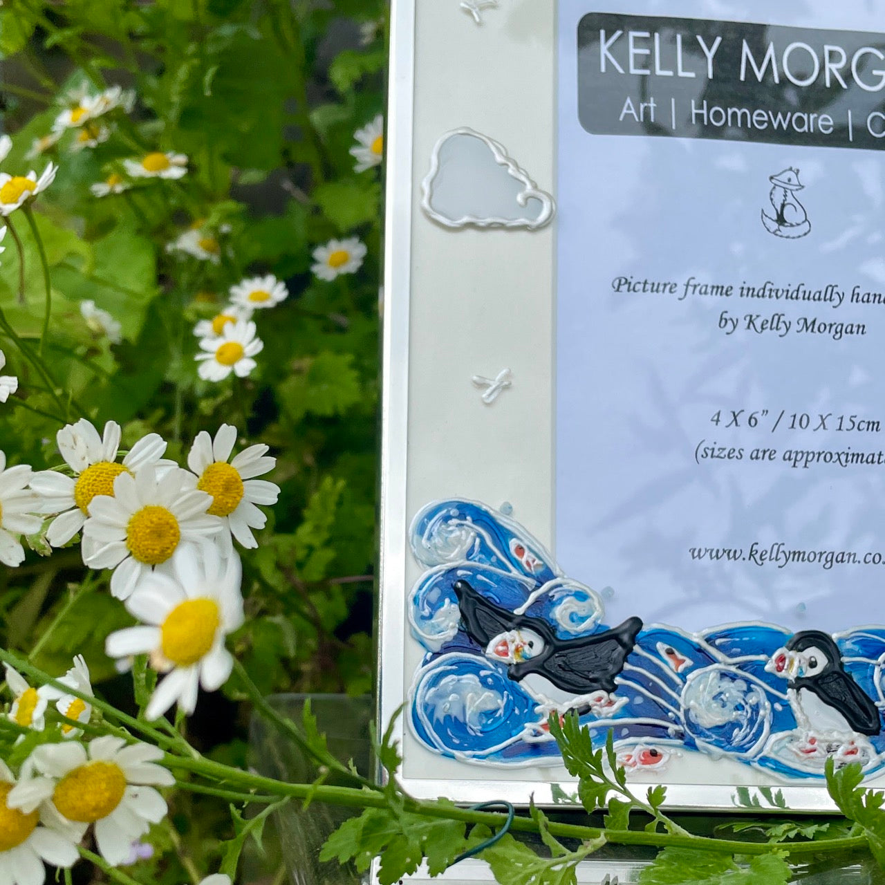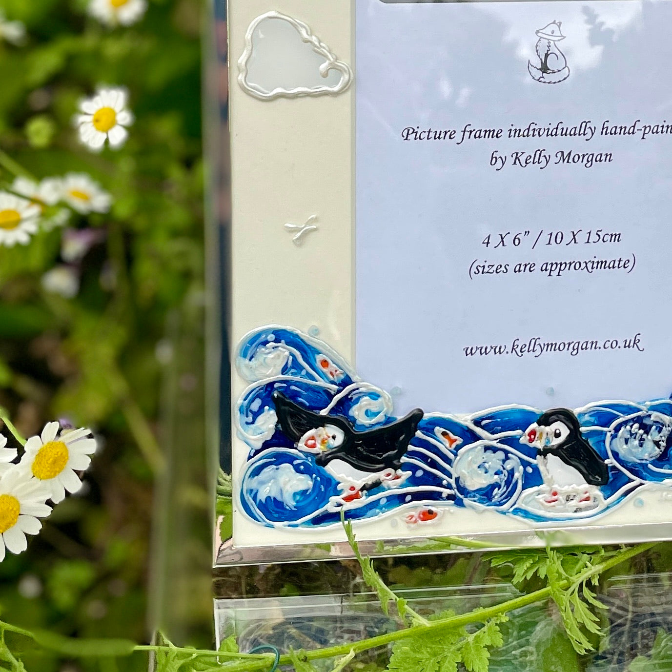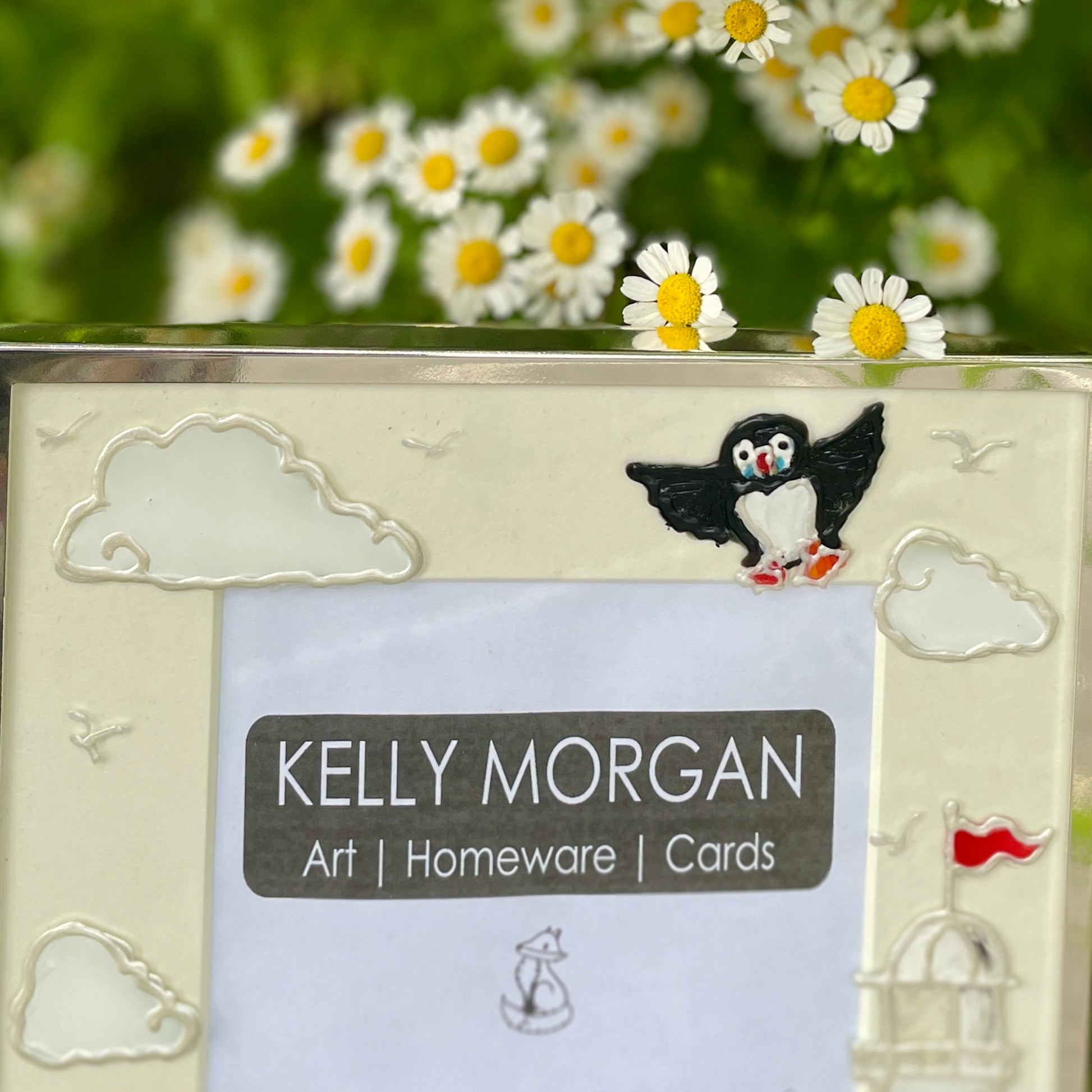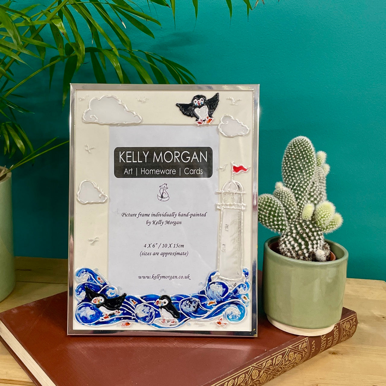 This silver-plated frame is individually hand painted by artist Kelly Morgan with her Seaside design. Kelly's Seaside design, with its vivid and attractive nautical colours is always a favourite. The striking lighthouse, swirling blue waves & puffins loving life, evoking happy seaside memories of the simple joys found at the seaside
