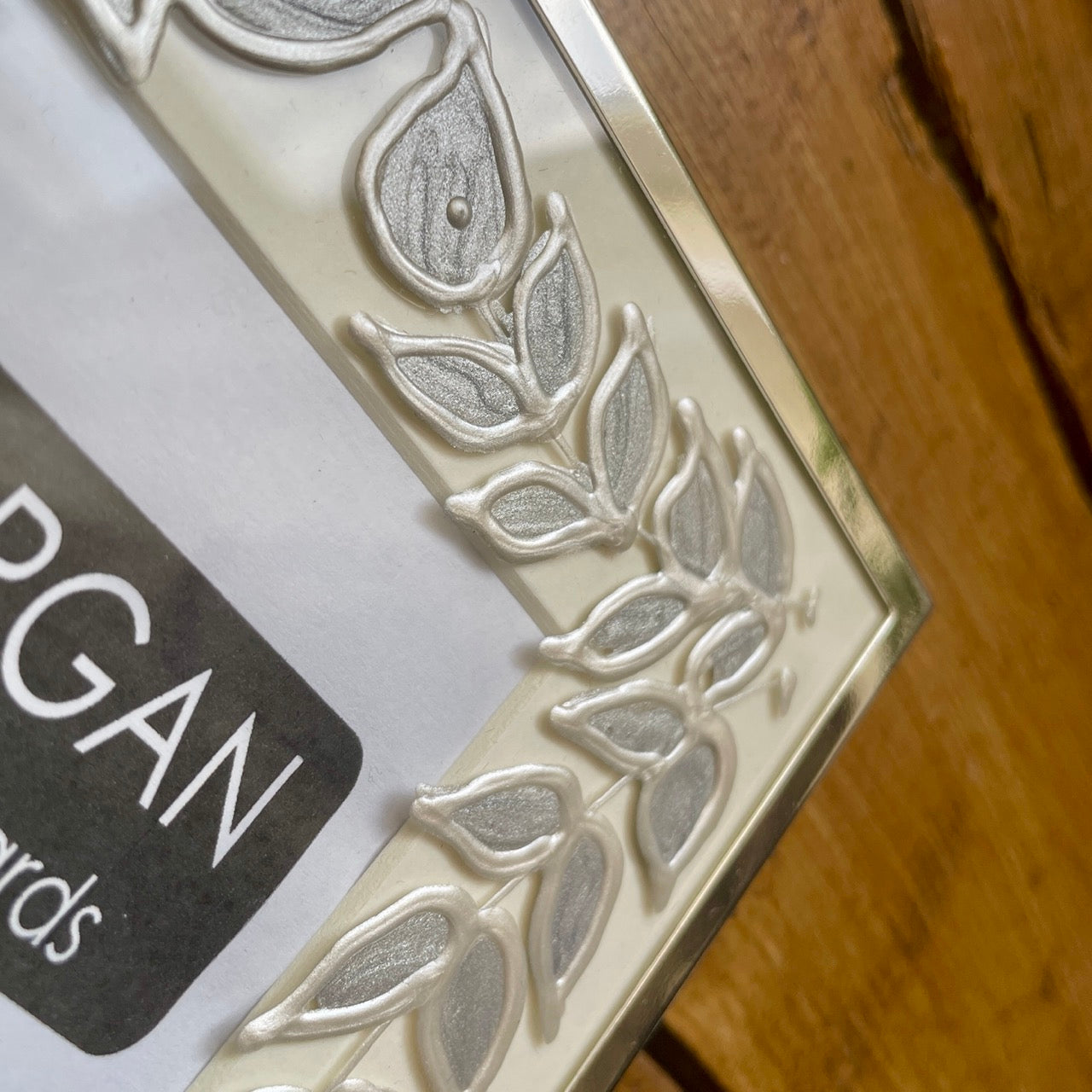 This silver-plated frame is individually hand painted by Kelly Morgan with her Silver Leaves design.