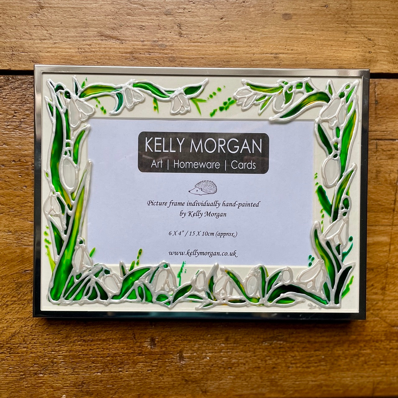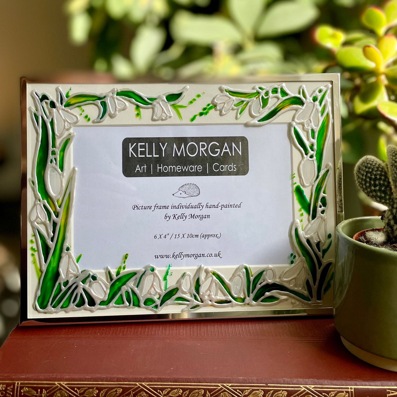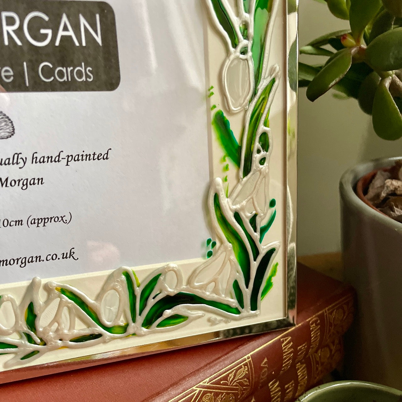 Kelly Morgan individually hand paints each of these silver-plated landscape frames with her Snowdrops design.
