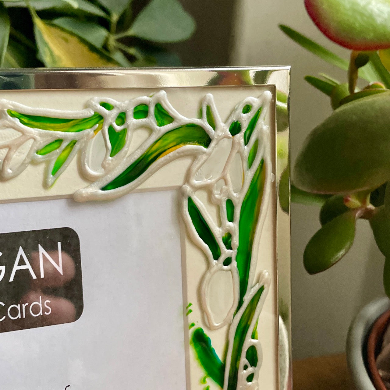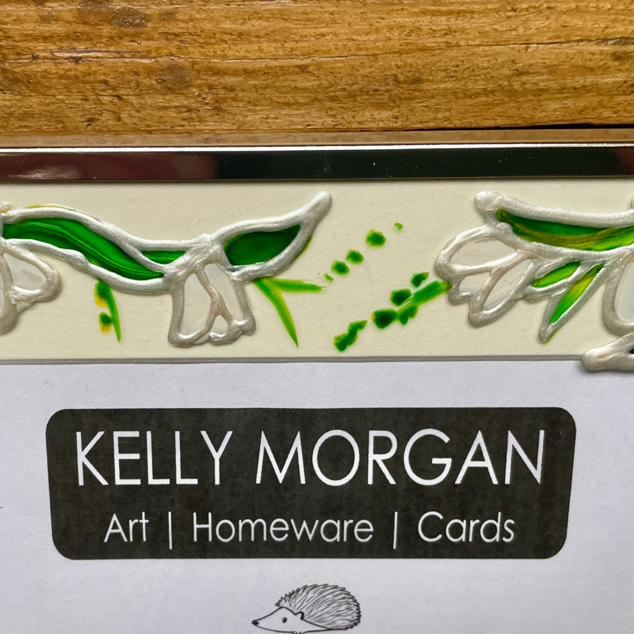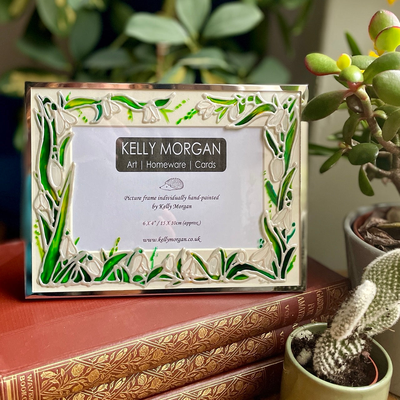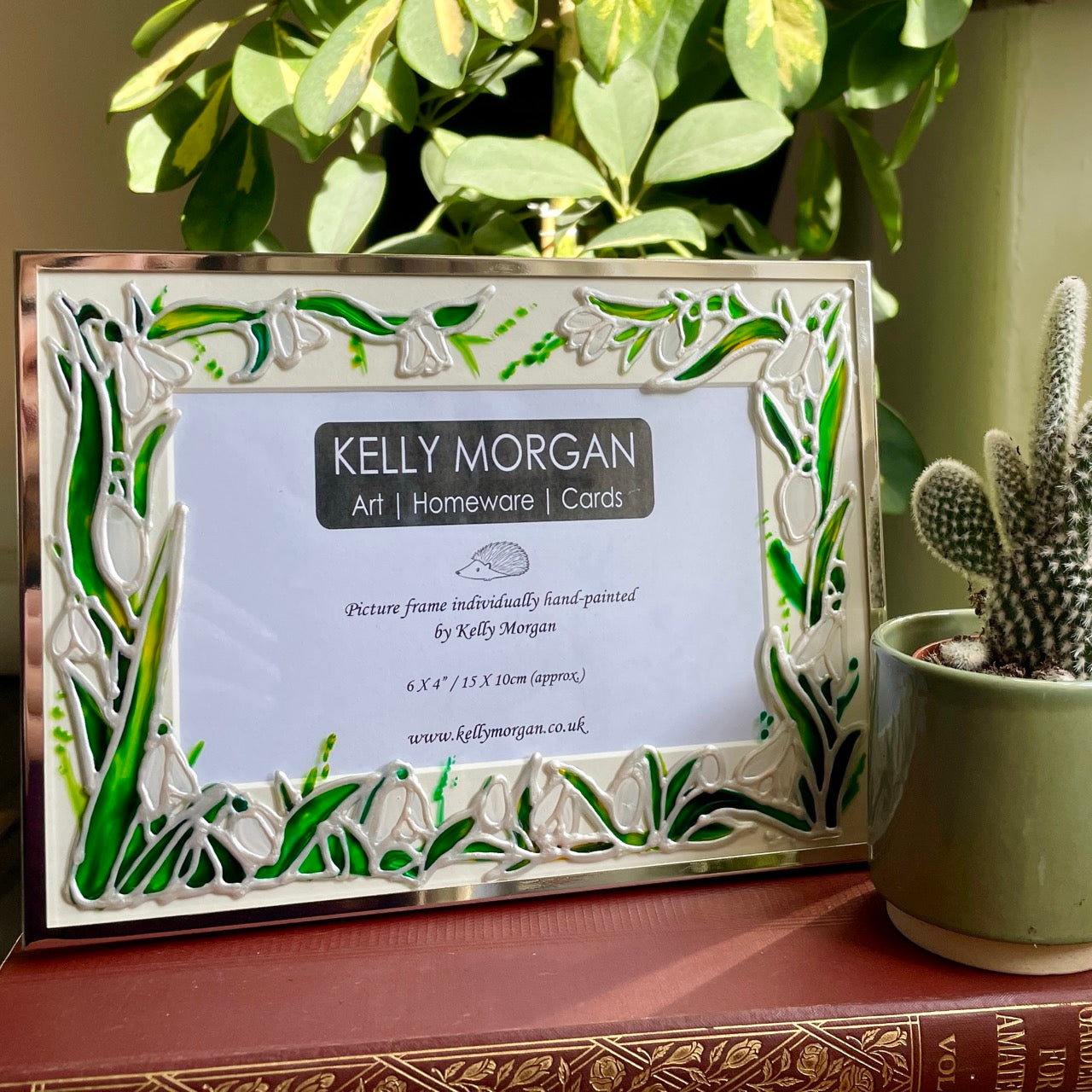 Kelly Morgan individually hand paints each of these silver-plated landscape frames with her Snowdrops design.