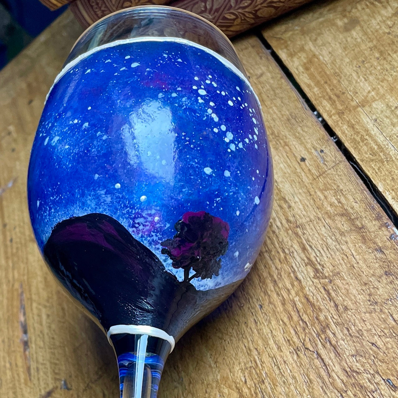 Kelly Morgan individually paints each Starry Sycamore wine glass, then fires it to make it dishwasher-safe. A perfect way to enjoy a glass of wine!