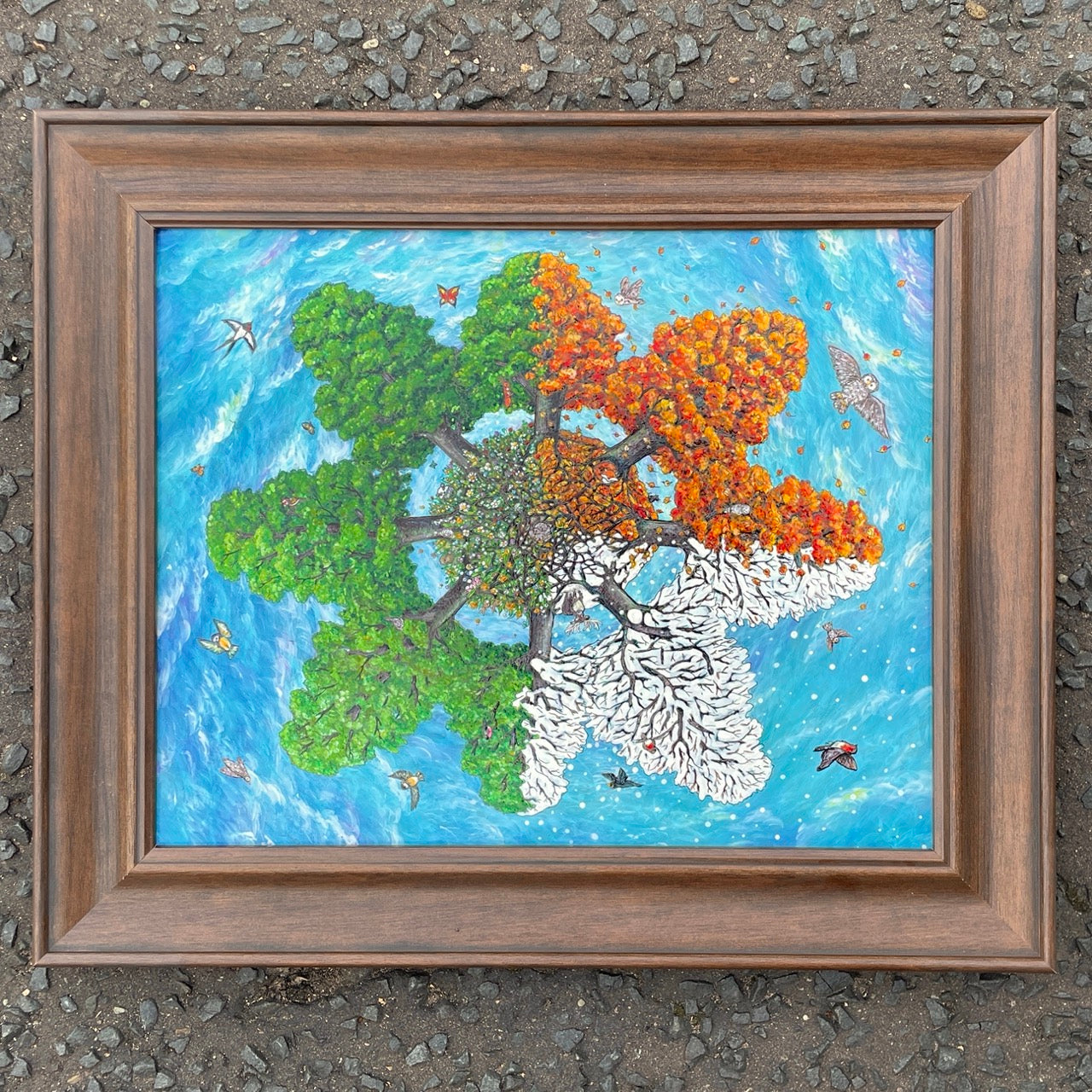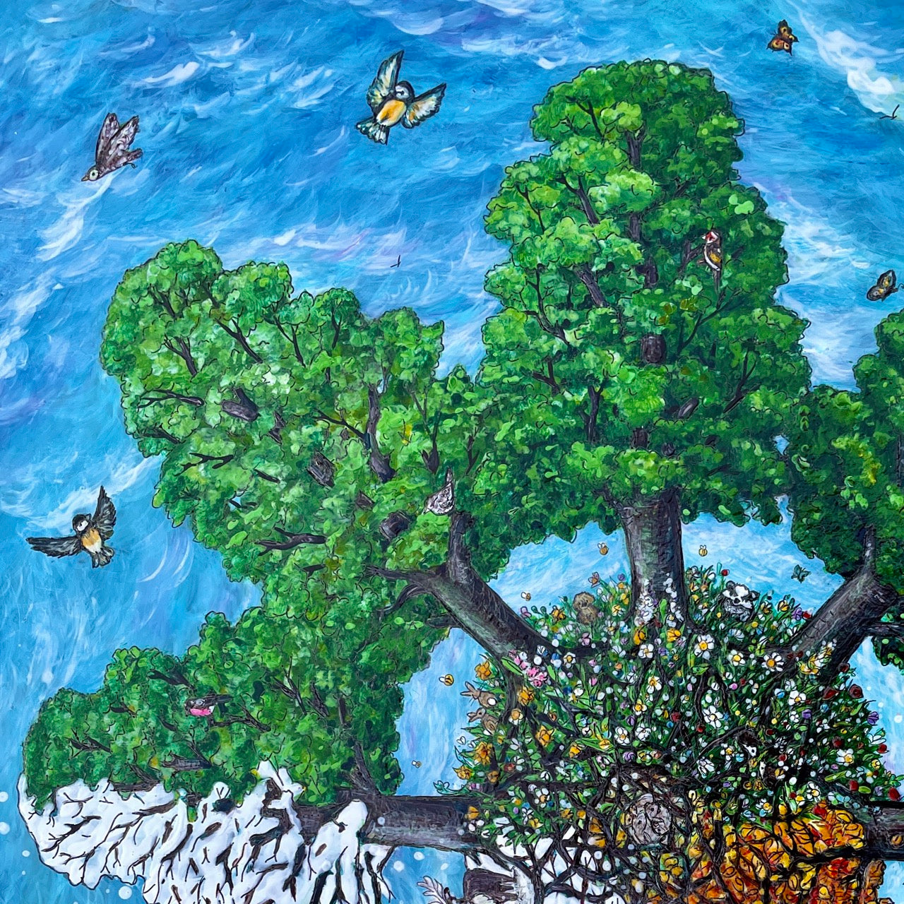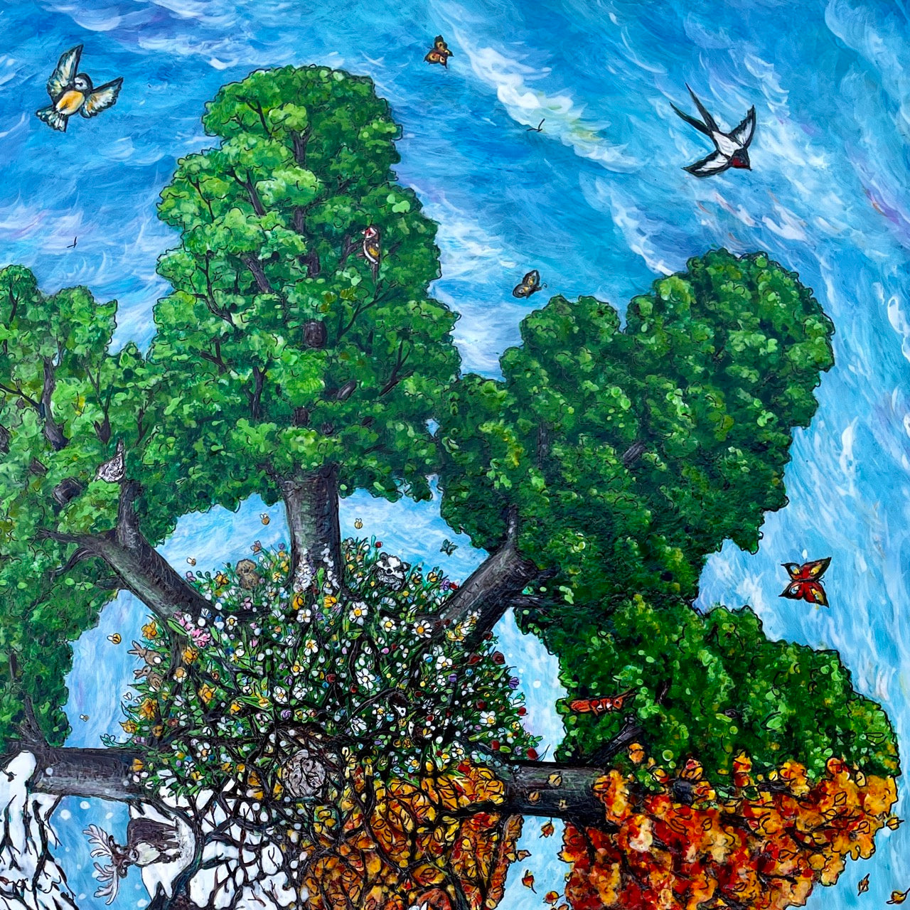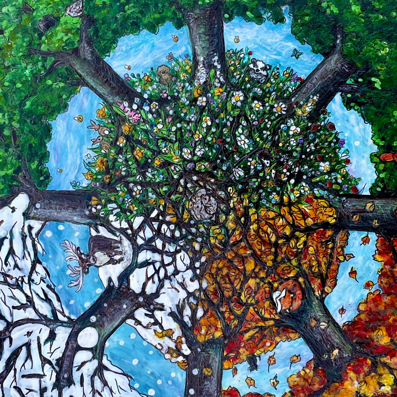 Artist Kelly Morgan continues her passion for celebrating the changing seasons through the whimsical charm of 'Time Flies, Seasons Change' - an original art piece capturing the essence of time, seasons, and the beauty of nature through a unique and quirky depiction of trees.