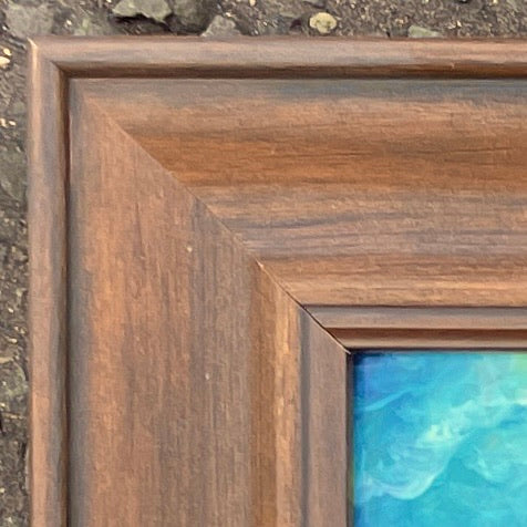 Details: specialist colourfast, water-based paint on glass; brown moulded frame.